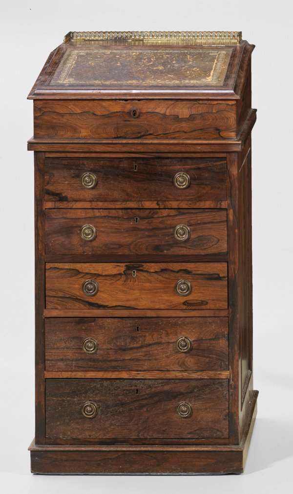 Kleiner Pultsekretär Palisander, furniert. Gerader, hochrechteckiger Korpus auf schmaler Profilzarge. In der geliederten Front fünf Schubladen. Oberhalb schräggestellte, aufklappbare Arbeitsfläche mit olivgrüner, goldgeprägter Ledereinlage. Seitlich kleines Schubfach für Tintenzeug sowie oberer Abschluss aus durchbrochen gearbeiteter Galerierahmung. H. 100 cm. 50 cm x 50 cm.