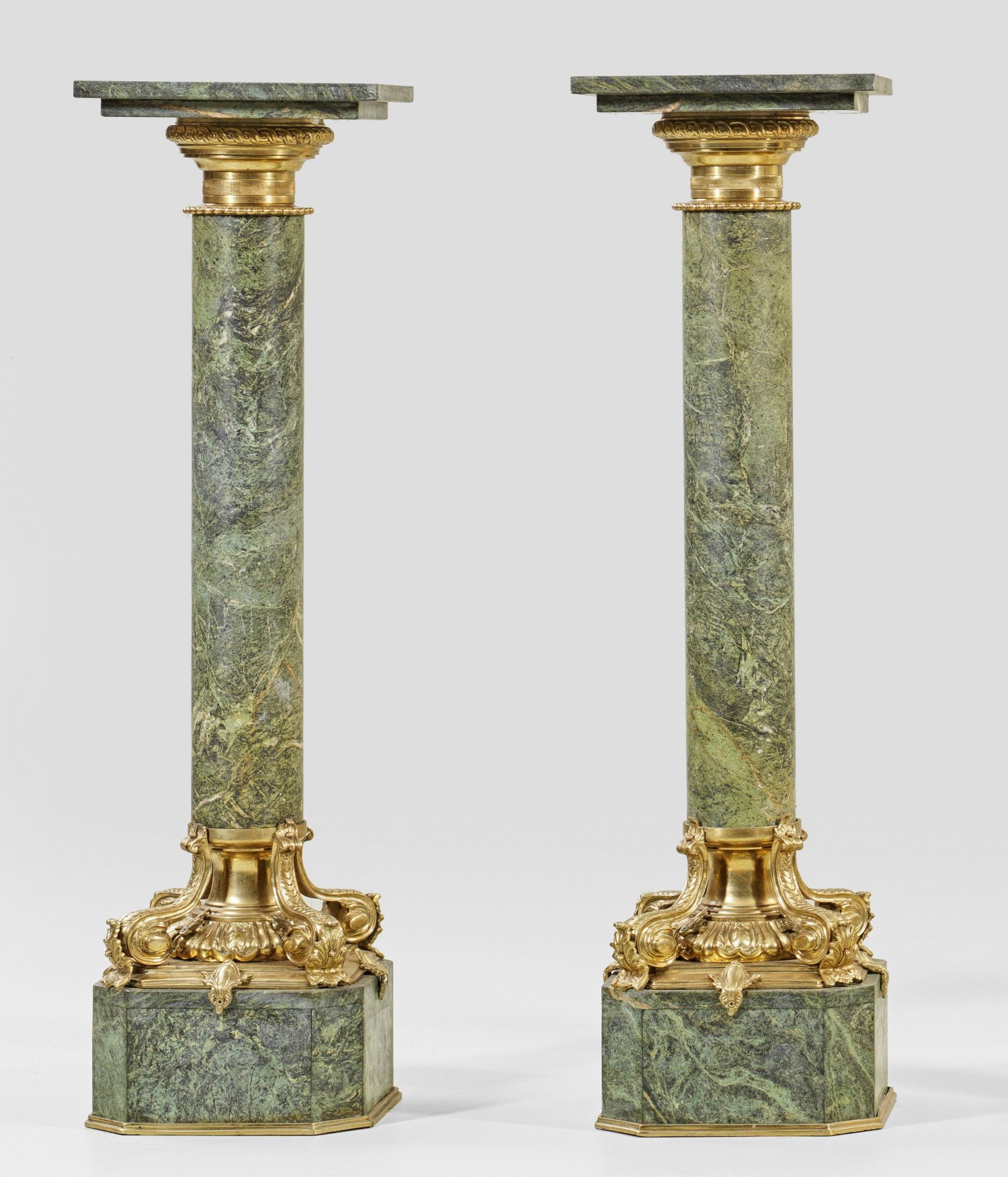 Paar Skulpturensäulen im Napoleon III-Stil Grüngemaserter Marmor und Bronze. Über quadratischem Sockel mit angeschrägten Ecken zylinderförmiger Säulenschaft mit profilierter, von Volutenspangen begleiteter Basis sowie korrespondierendem Kapitell als Träger für flache quadratische Deckplatte. H. 115 cm. 33 cm x 33 cm.