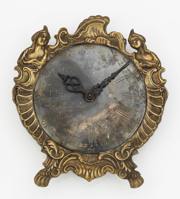 Wanduhr im Barock-Stil Metall. Reliefierte Rahmung aus Karyatiden und Muschelwerk. Rundes Zifferblatt und durchbrochen gestaltete Zeiger. Elektronisches Werk. Überholungsbedürftig. H. 24,5 cm.