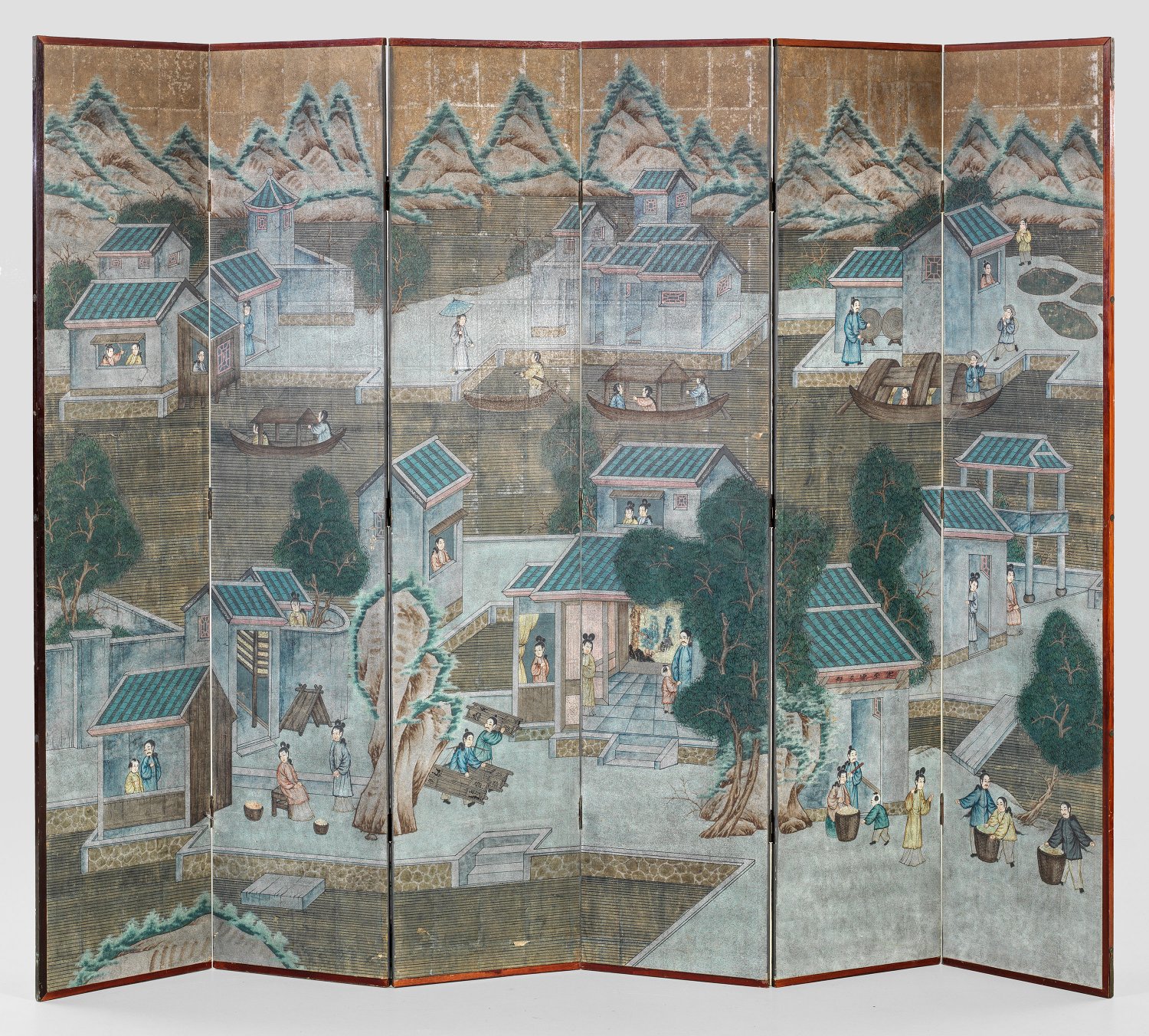 Großer chinesischer Paravent 6-tlg.; Schmale, hochrechteckige Paneele, flächendeckend belegt mit Papier. Schauseitig vielfigurige Darstellung einer chinesischen Standlandschaft mit Flusslauf sowie unterschiedlichen Handelsszenerien und Bergpanorama im Hintergrund. Umlaufend schmale Rahmung. Pro Paneel: 215 cm x 46 cm.