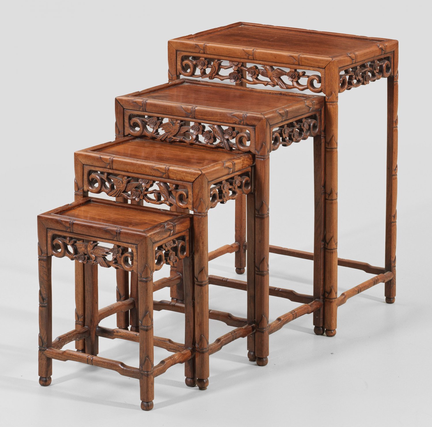Garnitur chinesischer Satztische 4-tlg.; Palisander, geschnitzt. Gerade, durchbrochen gearbeitete Zarge aus Voluten, Blüten und Vogelmotiven auf gerundeten Beinen, unterhalb durch gebogte Stege verbunden. Eingelassene Deckplatte. H. 40 cm - 69,5 cm. 30 cm x 20 cm - 48 cm x 34,5 cm.