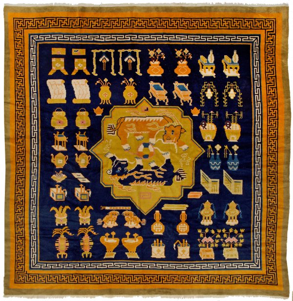 Quadratischer chinesischer Tempelteppich China. Wolle auf Baumwolle. Auf tintenblauem Fond großes, gelbgrundiges Zentralmedaillon mit Fo-Hunden sowie flächendeckende Musterung aus paarweise angeordneten Antiquitätensymbolen. Umlaufend mehrteilige Bordüre aus Swastik- und Mäanderbändern in Gold-Gelbtönen. 275 cm x 265 cm.