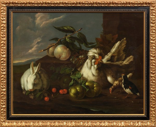 In feinflüssiger Malerei ausgeführte, ausgewogene Dreieckskomposition mit lebendiger Darstellung eines weißen Kaninchens und einer Henne mit Küken, zwischen denen unterschiedliche Früchte arrangiert sind. Öl/Lwd., doubl.; 59,5 cm x 76,5 cm. Rahmen.