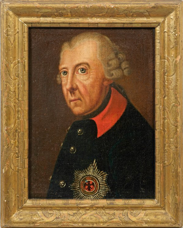 Repräsentatives Brustbildnis König Friedrich II. v. Preußen im Halbprofil. Uniformrock mit Bruststern des Schwarzen Adlerordens. Die ausdrucksvoll charakterisierende Darstellung ist durch das berühmte Porträt Anton Graffs aus dem Jahre 1781 beeinflusst. Öl/Lwd.; 41 cm x 30,5 cm. Rahmen.