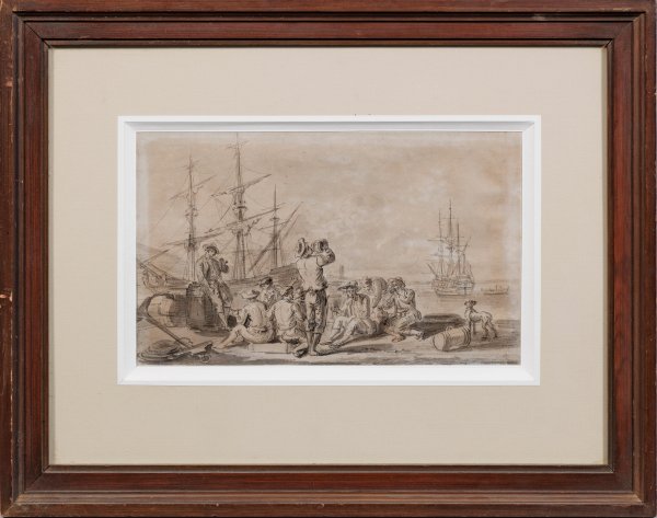 Virtuose Zeichnung Manglards, der ab 1715 in Rom tätig war und vor allem südliche Seehäfen und Küsten schilderte. Sein bedeutendster Schüler war Claude-Joseph Vernet, der von ihm maßgeblich geprägt wurde. Bleistift, Feder u. lavierte Tusche/Papier. 21 cm x 34 cm (Passepartoutausschnitt). Rahmen.