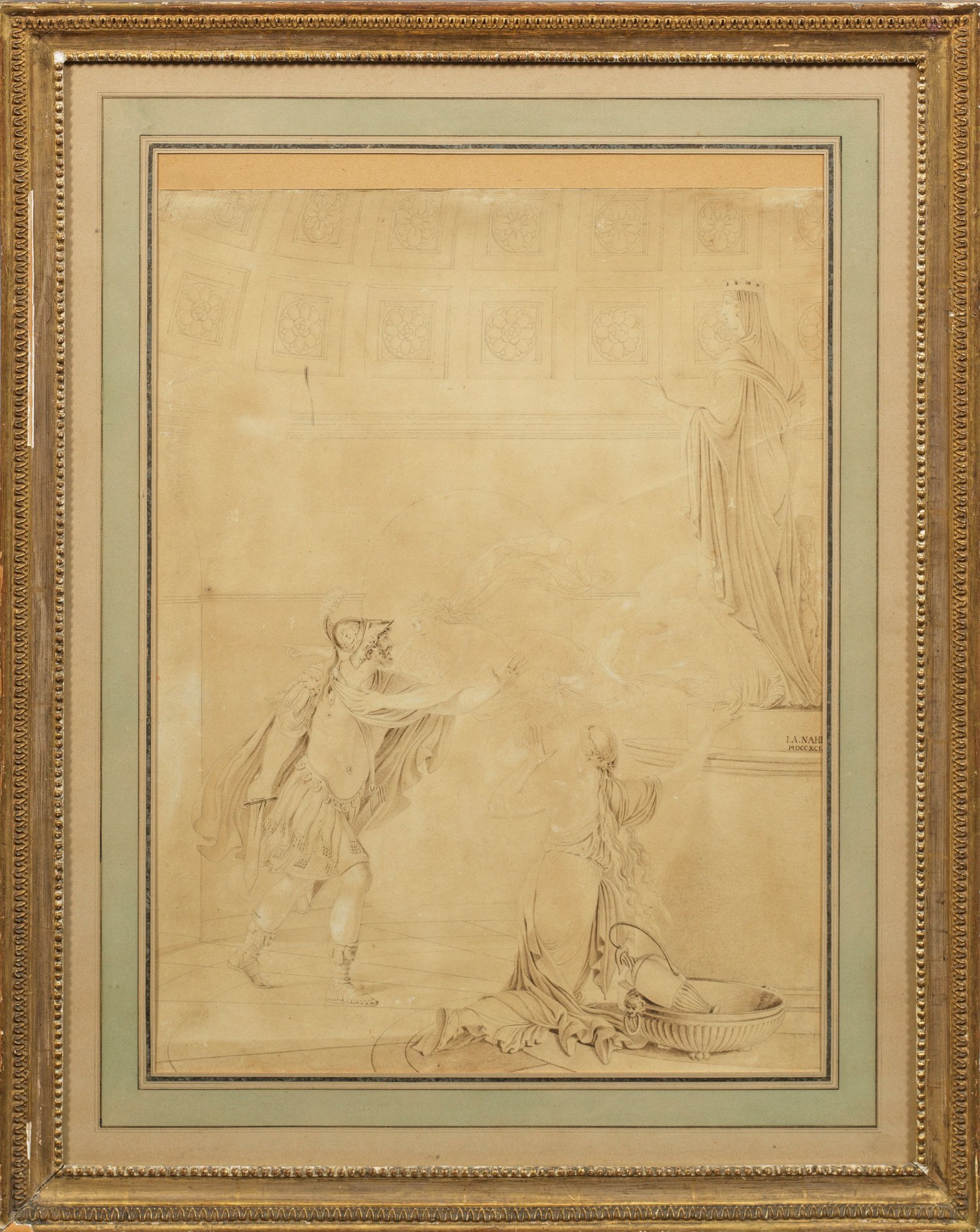 Studie für die 1793 voll ausgeführte Zeichnung in der Albertina in Wien (Inv.-Nr. 14842). Dargestellt ist eine Szene aus dem Trojanischen Krieg im Tempel der Vesta nach Vergil. Nahl erhielt seine malerische Ausbildung bei J. H. Tischbein d. Ä. in Kassel, an der Pariser Akademie sowie in Straßburg und Bern. Die vorliegende Zeichnung entstand während seines zweiten Rom-Aufenthaltes (1783-1792) und zeigt Einflüsse Jacques Louis Davids. Feder u. Pinsel (bzw. lavierte Tusche) in Braun sowie Weißhöhungen/Papier. Am rechten Bildrand sign. u. röm. dat. 1791. Ca. 55 cm x 42 cm. Rahmen.
