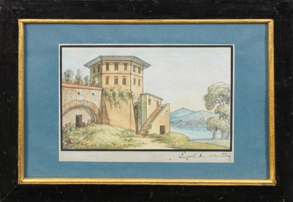 Vedute eines wohl am Rhein gelegenen Turmes. Wohl um 1800-1810 entstandenes Blatt des talentierten, vielleicht erst zehnjährigen Prinzen, das er selbstbewusst signierte. Es ist eine künstlerisch durchaus überzeugende Ansicht, wie sie noch um 1800 zum Bildungsrepertoire im obligatorischem Zeichenunterricht junger Adlige gehörte. Aquarell, Deckweiß, Feder u. Bleistift/Papier. R. u. sign. u. dat. "Leopold, den 11ten Maiy". Verso Brandstempel, Inventar-Etikett "Bauschlott Inventur-No. 218", Rest eines Inventar-Etiketts aus Schloss Salem. Darstellung ca. 15,5 cm x 23 cm. Rahmen.