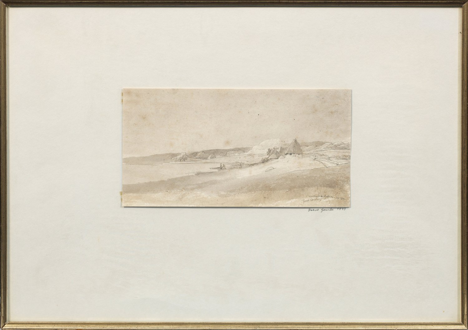 Blick auf die Küstenlandschaft mit Fischerhäusern. Reizvolles, romantisches Blatt des Künstlers, der insbesondere Landschaften in Schleswig-Holstein und der Umgebung Hamburgs malte. Die bedeutendste Gensler-Sammlung besitzt die Hamburger Kunsthalle. Feder u. lavierte Tusche/Papier. R. u. sign., betitelt u. dat. Sept. 1833. Ger. stockfleckig. 13 cm x 25,8 cm. Rahmen.