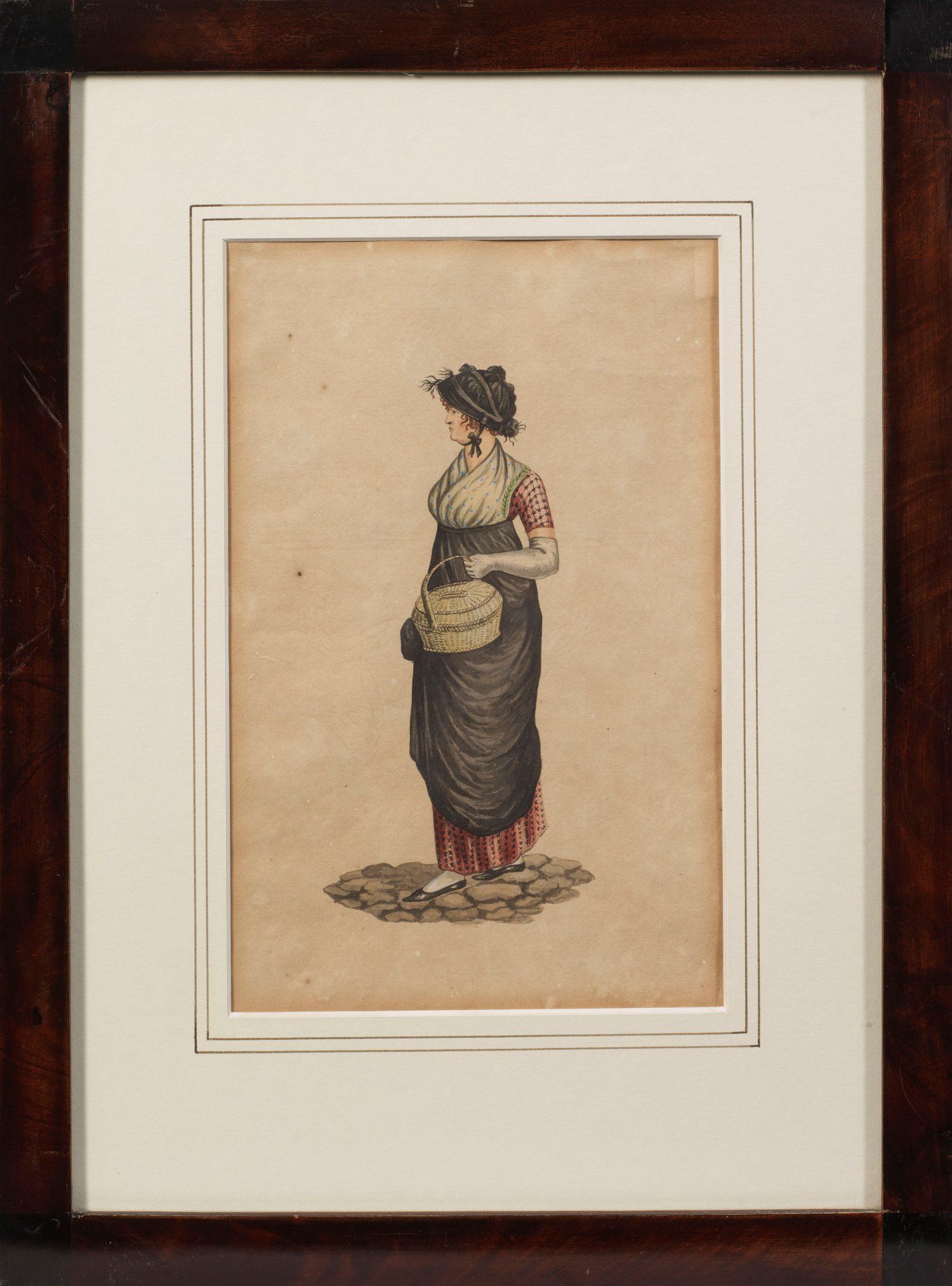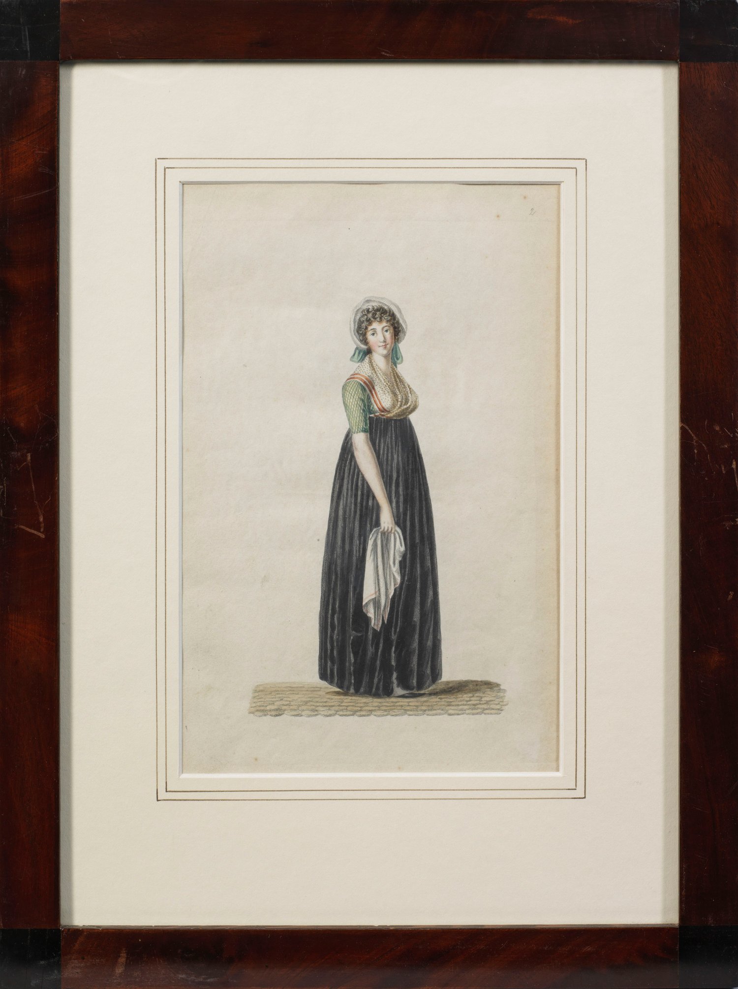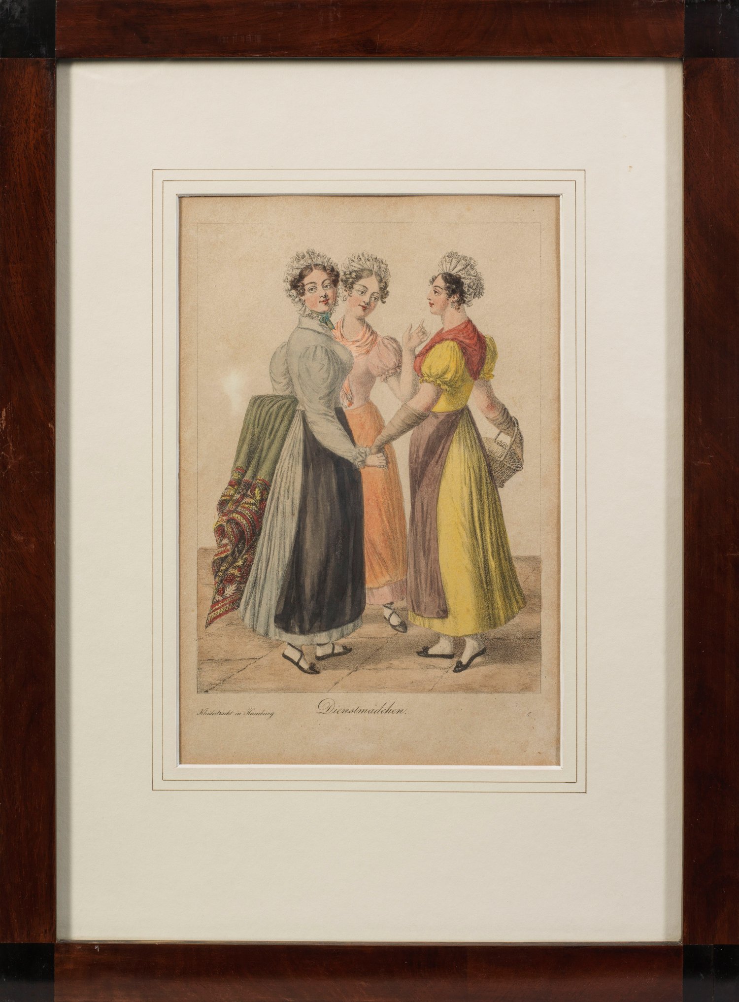 Drei Modebilder für Dienstboten Zwei Aquarelle und eine Lithographie auf Papier, um 1810/20. Alle drei Blätter zeigen Dienstbotenbekleidung für Frauen aus dem Empire und Biedermeier. Stockfleckig. 27,5 cm x 19 cm (Passepartoutausschnitt). Rahmen.