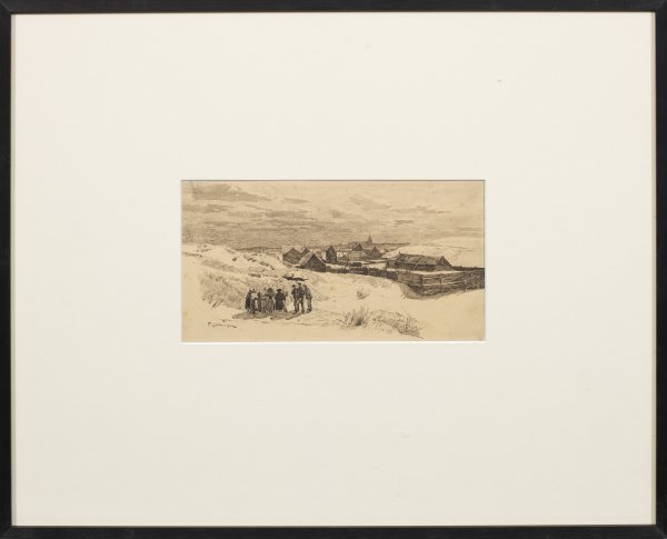 Sehr fein und detailreich gezeichnete Szenerie, im Vordergrund der von Fischern umringte Maler an der Staffelei, im Hintergrund das Fischerdorf, wohl Scheveningen. Reizvolles, auf einer der Holland-Reisen mit Hermann Baisch und Gustav Schönleber entstandenes Blatt. Feder u. lavierte Tusche/Paper. L. u. sign.; 13,5 cm x 23,5 cm.