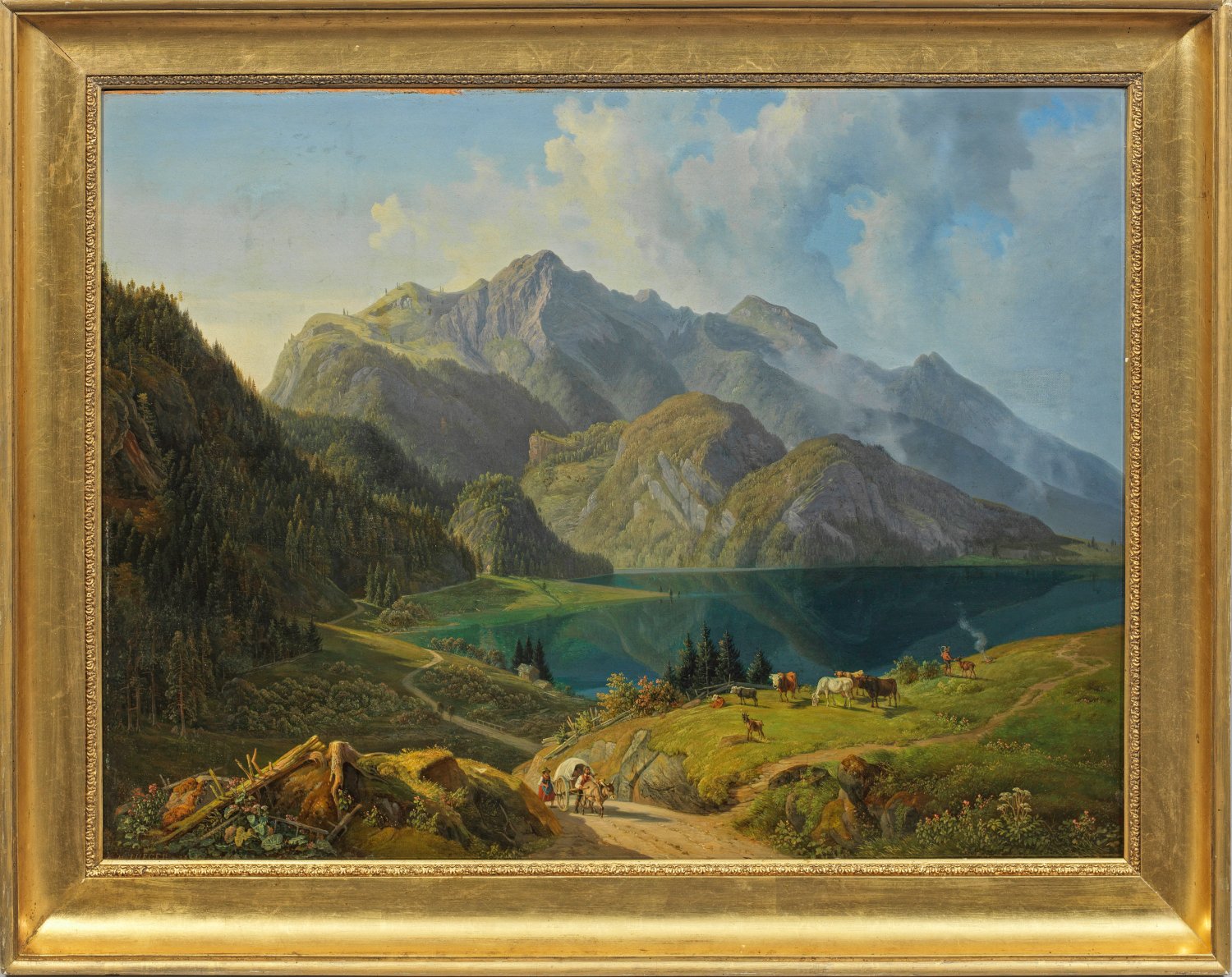 Gemälde der romantischen Schule mit feinmalerisch-detailliert ausgeführter Vordergrundbühne, auf der sich Tiere und Bergbauern bewegen, im Hintergrund ein erhabenenes Bergpanorama. Lueger, Landschaftsmaler der Münchner Schule, spezialisierte sich auf die alpine Bergwelt. Öl/Lwd., auf Holz maroufliert. R. u. sign. u. dat. (18)31. 56 cm x 76 cm. Rahmen.