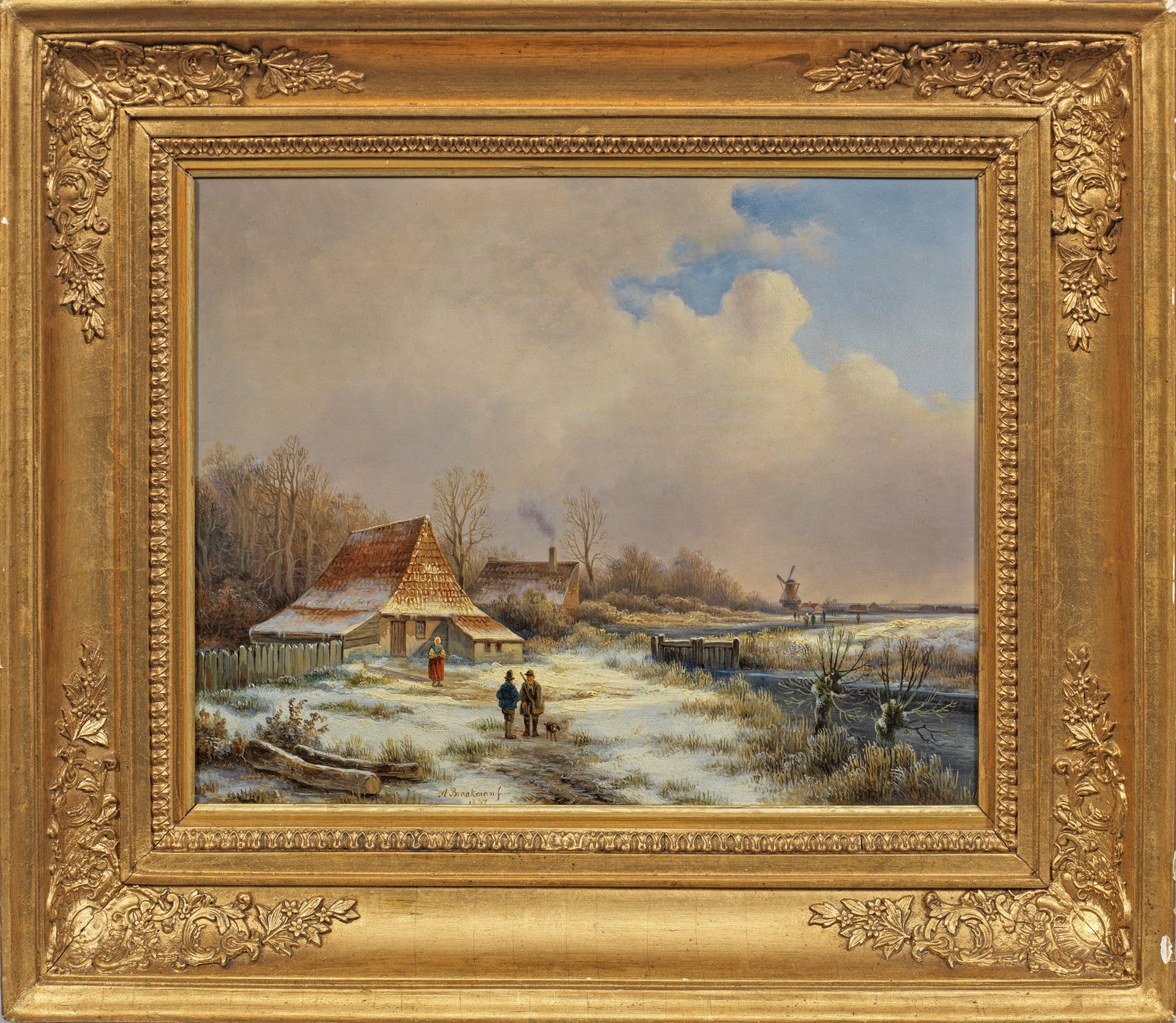 Mit feinem Pinsel und lichten Lokalfarben gemaltes Kabinettbild des Niederländers Braakman, der seine Ausbildung in Den Haag bei Andreas Schelfhout erhielt, in dessen Nachfolge seine ruhigen niederländischen Winter- und Sommerlandschaften stehen. Öl/Holz. M. u. sign. und dat. 1837. 25 cm x 31 cm. Rahmen.