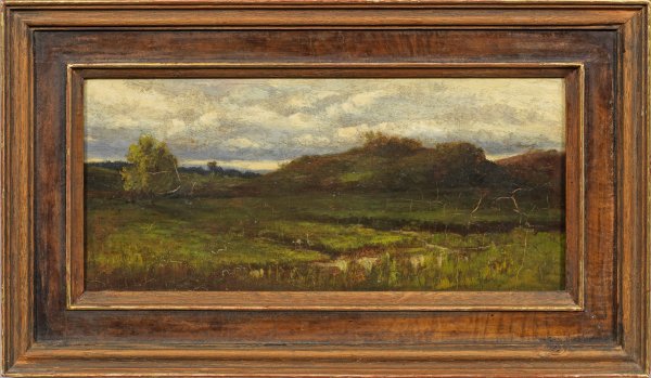 mit zwei Reihern am Wasser. Spontan und treffsicher gemalte Landschaftsstudie im typischen kleinen, gestreckten Querformat. Schleich war einer der Hauptmaler der Dachauer Künstlerkolonie und Wegbereiter der Münchner Landschaftsmalerei. Öl/Holz. Verso von alter Hand bez.: Schleich. 14,5 cm x 32,5 cm. Rahmen.
