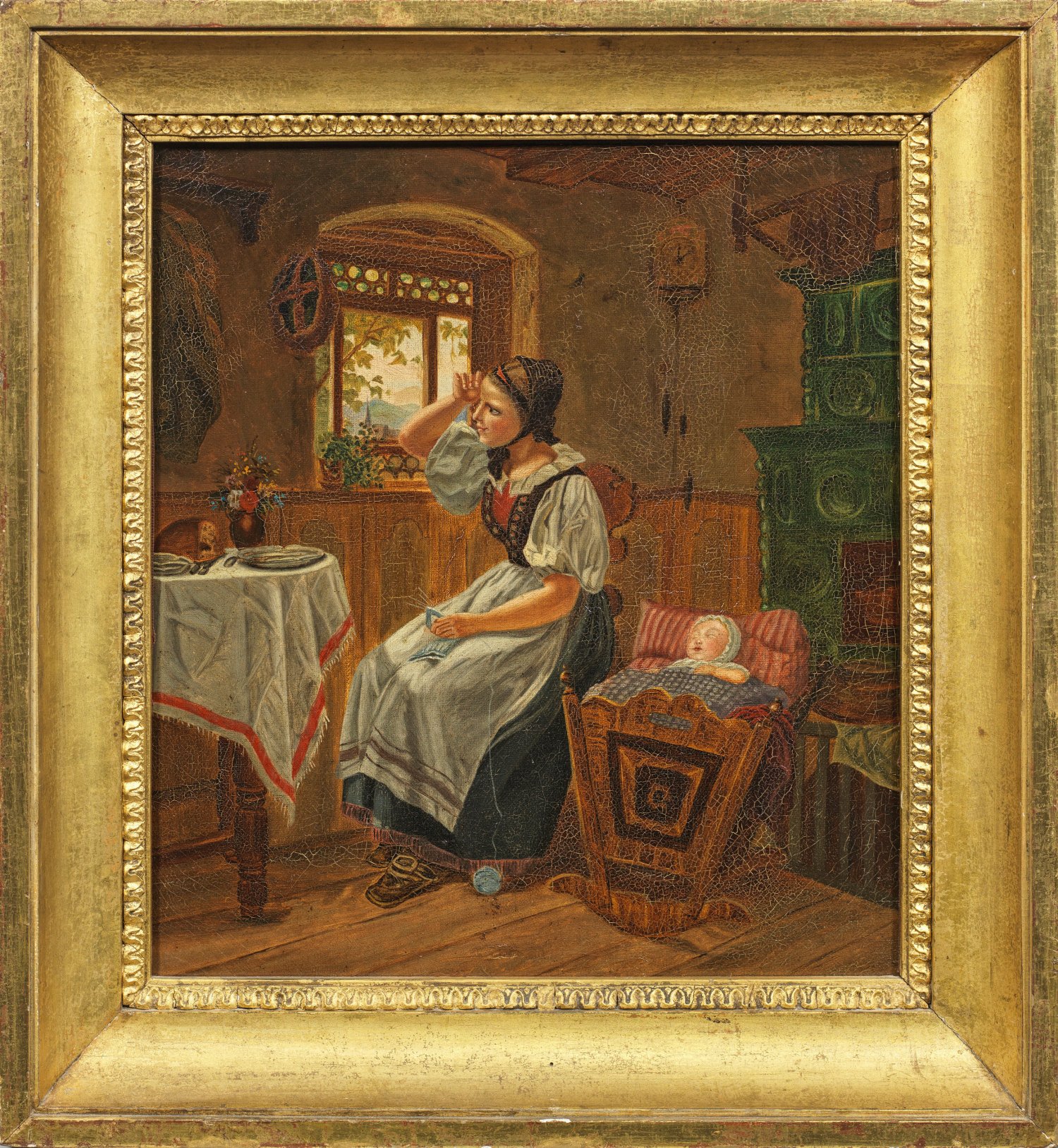Detailreich erzähltes Genre im Biedermeierstil. In einer kleinen holzgetäfelten Kammer eine aus dem Fenster blickende, junge Mutter,neben ihr der schlafende Säugling. Öl/Lwd., doubl.; 38 cm x 34 cm. Rahmen.