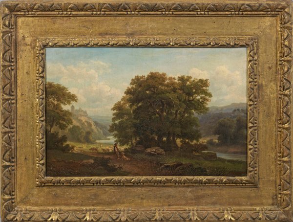 Spätromantische Landschaft Chevaliers, der bei Wilhelm Krause an der Berliner Akadamie studierte und 1856-1870 wiederholt die Akademie-Ausstellungen beschickte. Er malte bevorzugt Motive aus der Mark Brandenburg, dem Harz und der Sächsischen Schweiz. Öl/Lwd.; R. u. sign.; Verso auf Original-Etikett des Preußischen Kunstvereins bez. u. betitelt. 38 cm x 60 cm. Rahmen.