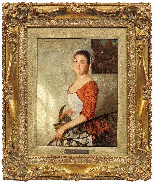 Motiv aus der Rokoko-Zeit. Durch die Lichtführung und das rote Kleid koloristisch effektvoll gemaltes Genrebild Ambergs, der häufiger heitere Darstellungen mit Dienstmädchen-Motiven des 18. Jhs. malte. Der u. a. an der Berliner Akademie und in Paris ausgebildete Amberg wurde vielfach ausgezeichnet. Sein Hauptwerk "Vorlesung aus Goethes Werther" von 1870 befindet sich in der Nationalgalerie in Berlin. Öl/Mahagonitafel. L. o. sign. mit Ortsangabe Berlin. 27 cm x 20,5 cm. Rahmen.