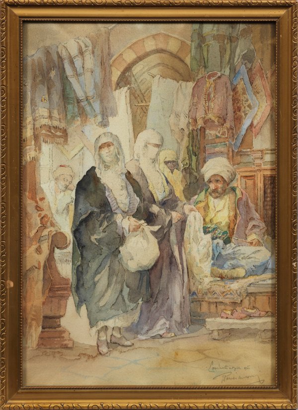 Repräsentatives Blatt des Künstlers, der besonders durch seine lebendigen Straßenszenen und impressionistisch aufgefassten Veduten aus Konstantinopel bekannt wurde. Aquarell über Bleistift/Bütten. R. u. sign. u. undeutl. dat. mit Ortsangabe "Constantinople". 42,5 cm x 29,5 cm. Rahmen.