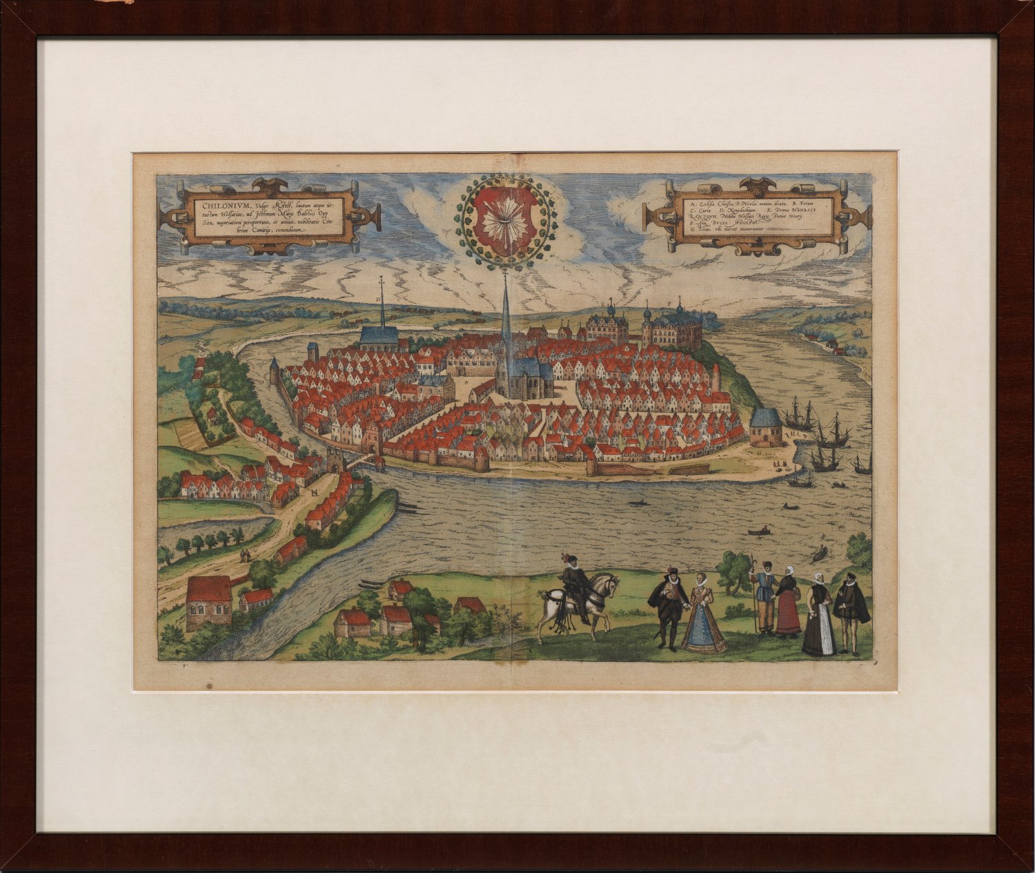 Frühe Renaissance-Ansicht von Kiel im Jahre 1588 Altkolorierter Kupferstich/Papier, 1588/1594. Blick aus der Vogelschau mit Staffage aus vornehmen Figuren und Reitern, oberhalb Wappen sowie Titel- und Inschrift-Kartuschen. Die damals lateinisch als "Chilonium" bezeichnete Stadt wurde in dieser berühmten Ansicht erstmals 1588 in Bd. 4 des von Georg Braun und Franz Hogenberg in Köln erschienenen Werkes "Civitates orbis terrarum" publiziert. Sie prägte alle weiteren Kiel-Veduten bis ins 18. Jh.; Plattenmaß ca. 32,5 cm x 48 cm. Rahmen.