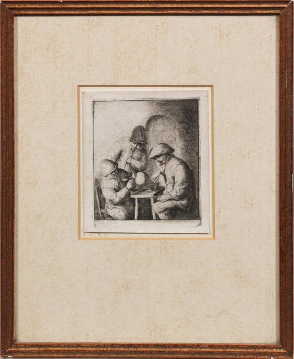 Radierung/Papier, um 1653. In der Platte sign.; Sehr kraftvoller, tiefer, ausgezeichneter Abzug der von Ostade überarbeiteten Platte mit ca. 5-8 mm Blattrand. Plattenmaß ca. 10,4 cm x 8,8 cm; Blatt 11,5 cm x 10,3 cm. Rahmen.