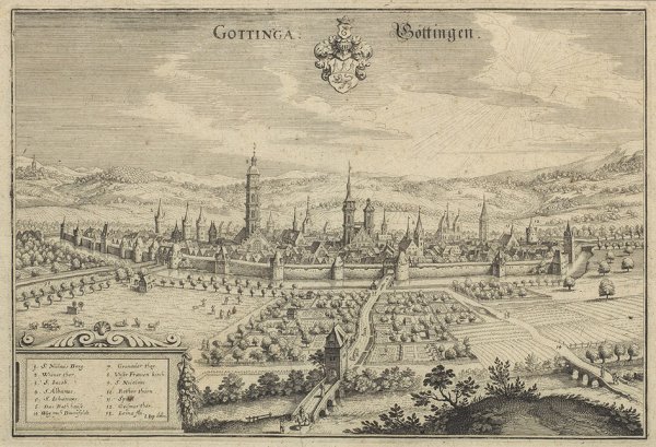 Scarce copper engraved view of Göttingen by Matthäus Merian the Elder published in 1641.