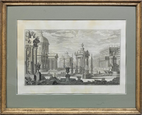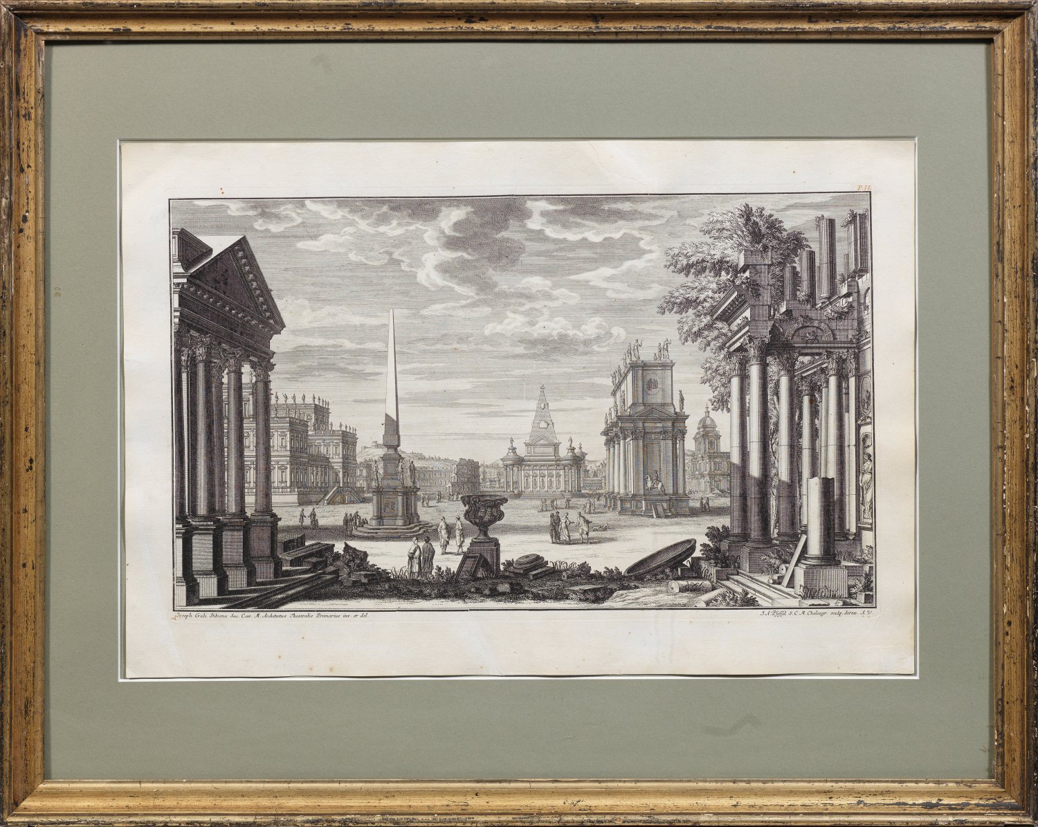 Kupferstiche/Bütten. Jeweils in der Platte sign. u. bez.; Blatt 10 aus dem 1. bzw. Blatt 7 aus der 2. Teil der Folge "Architetture e Prospettive dedicate alla maestà di Carlo Sesto Imperador de Romani da Giuseppe Galli Bibiena etc.", Augsburg 1740. Plattenmaß 30 cm x 49,5 cm; Blatt 37,5 cm x 55 cm. Rahmen