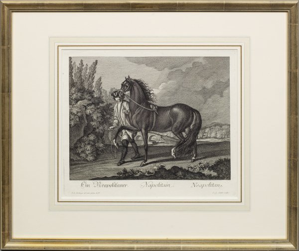 Kupferstich von Johann Gottfried Seutter (Stiefsohn Ridingers) nach J. E. Ridinger, Augsburg, um 1750. Aus einer reichen Folge Ridingers mit Pferderassen verschiedener Länder (sog. "Nationenpferde"). In der Platte sign., mit deutsch-französisch-lateinischem Bildtitel. Wvz. Thienemann 583. Plattenmaß ca. 28,5 cm x 34,5 cm. Rahmen.