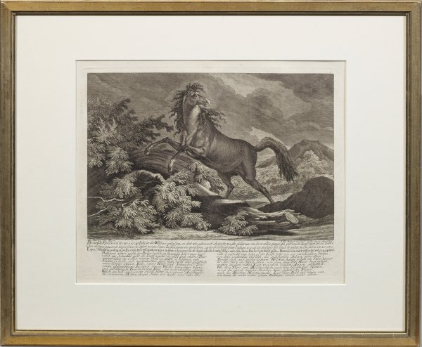 Kupferstich/Papier, 1736. In der Platte sign., unterhalb deutsch-französisch-lateinische Bildtitel und Verse von Barthold Heinrich Brockes - "Wie dies Thier ein Meisterstücke von der bildenden Natur, so ist (...) auch des Meisters Meisterstucke. Las dies Bild das letzte seyn, ich kann dir nicht weiter folgen Ridinger, sonst mahl allein". Blatt 40 (Schlussblatt) aus Ridingers "Betrachtung der wilden Thiere (...)", Augsburg 1736. Wvz. Thienemann 234. Plattenmaß ca. 34,5 cm x 42,5 cm. Rahmen.
