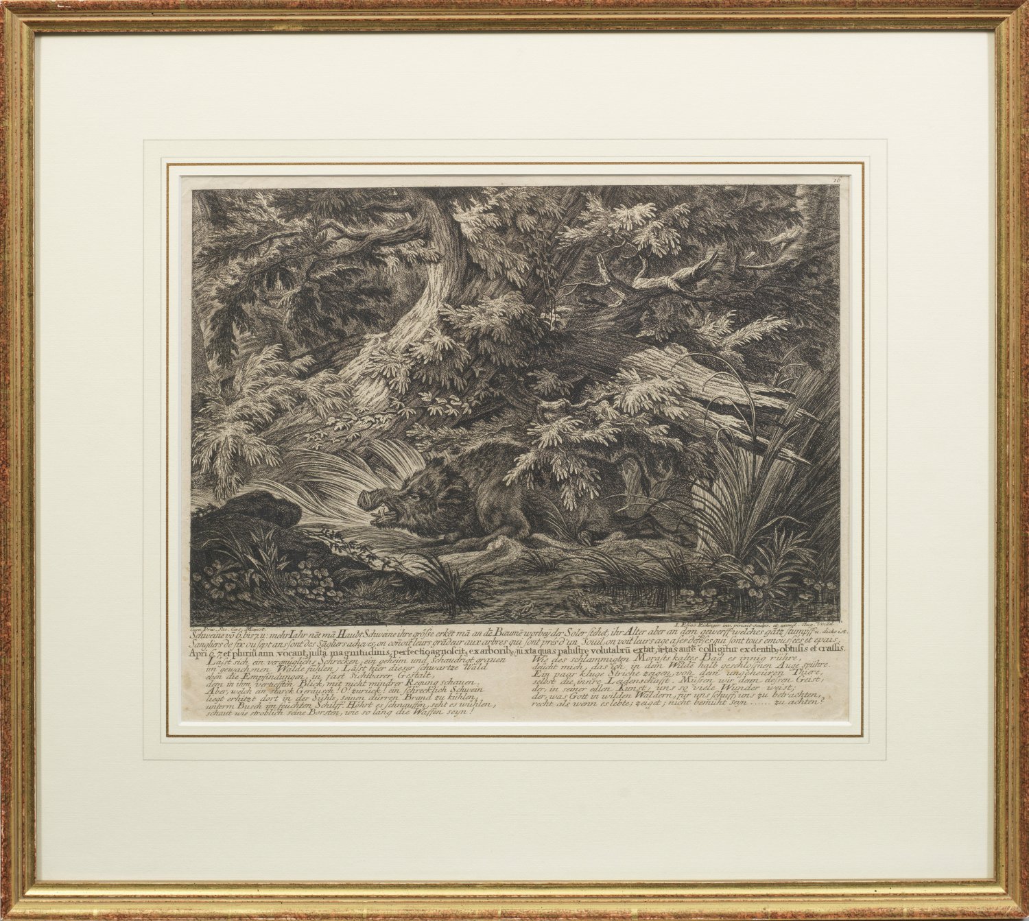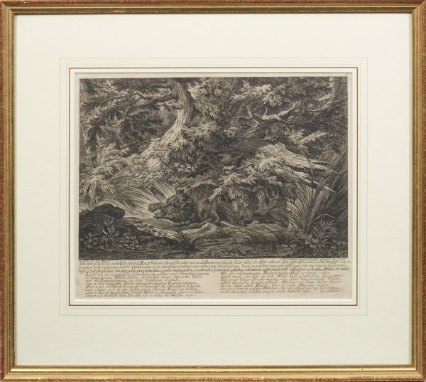 "Schweine von 6 bis 7 und mehr Jahr nennt man Haubt Schweine (....)" (Originalitel). Kupferstich/Papier, 1736. In der Platte sign., unterhalb deutsch-französisch-lateinische Bildtitel und Verse von Barthold Heinrich Brockes. Blatt 16 aus Ridingers "Betrachtung der wilden Thiere (...)", Augsburg 1736. Wvz. Thienemann 211. 33,5 cm x 41 cm (Passepartoutauschnitt). Rahmen.