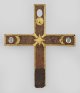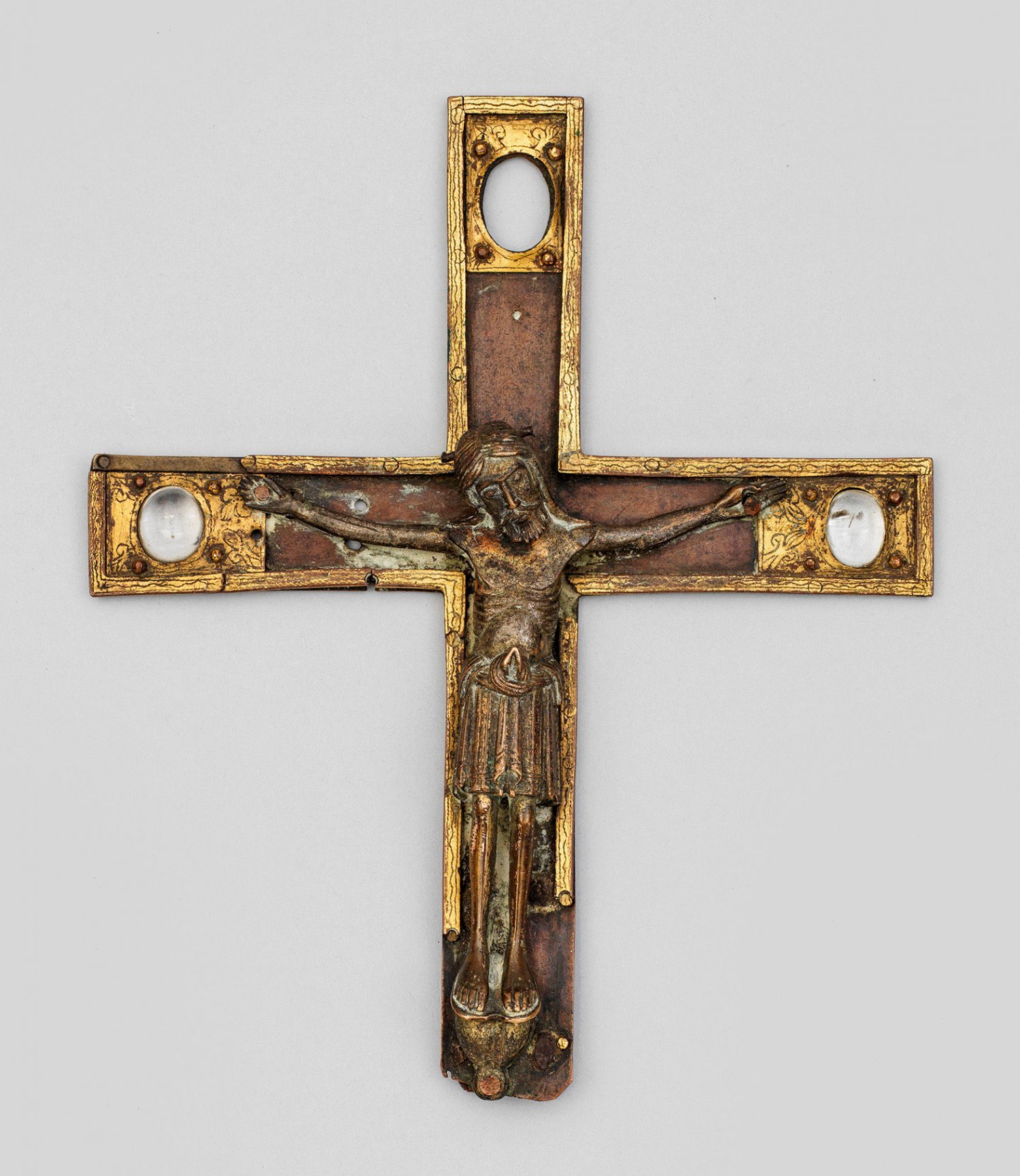 A rare German Romanesque partially gilt bronze cruficix with inlaid rock crystals. Minor flaws consistent to age, one rock crystal lost.