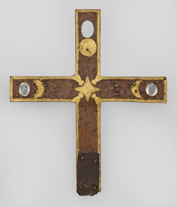 Museales romanisches Bronzekruzifix Corpus Christi mit Resten von Vergoldung. Das Kreuz mit erhabenen, aufgesetzten Profilkanten, verziert mit fein ziseliertem Wellenband. An den oberen Kreuzenden eingelassene, angenietete Filigranplatten aus vergoldetem Messing- oder Kupferblech mit stilisierten, ziselierten Lilien, darin an den Enden des Querbalkens zwei eingelassene, ovale Bergkristall-Cabochons. Rücks. im Kreuz ziselierte und vergoldete Sonnen-, Mond- und Sternsymbole. Der Corpus Christi im Viernageltypus mit frontal dem Betrachter zugewandtem Körper und diagonal zur rechten Seite geneigtem Kopf, die Augen geschlossen. In seiner straff aufgebauten Körperlichkeit mit kantig angelegten, symmetrischen Rippenbögen und oberhalb spitz angesetzter Bauchpartie, dem symmetrisch gestalteten Lendentuch mit streng vertikalen Falten und Mittelknoten sowie der tropfenförmigen Konsole mit Ösenabschluss folgt der Corpus Christi dem Typus des bekannten "Rogerus"-Kruzifix im Schnütgen-Museum in Köln. Dieses wird (wie auch eine Variante, die sich ehemals in der Sammlung Neuerburg in Köln befand) dem Umkreis des Rogerus von Helmarshausen zugeschrieben und um 1100 datiert. Die alte Montierung und die Beschädigungen am unteren Kreuzende lassen zusammen mit der ausgearbeiteten Rückseite darauf schließen, dass das vorliegende Kruzifix als Vortragekreuz geschaffen wurde bzw. als solches diente. Altersspuren, ein Bergkristall verloren. 23,5 cm x 19,5 cm.