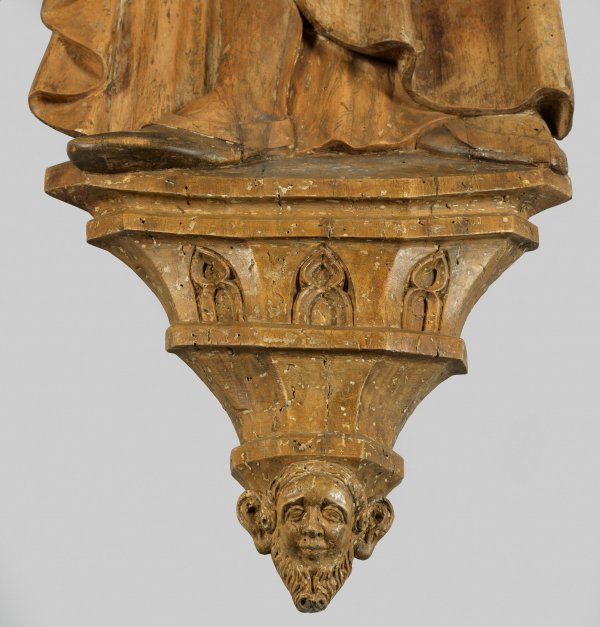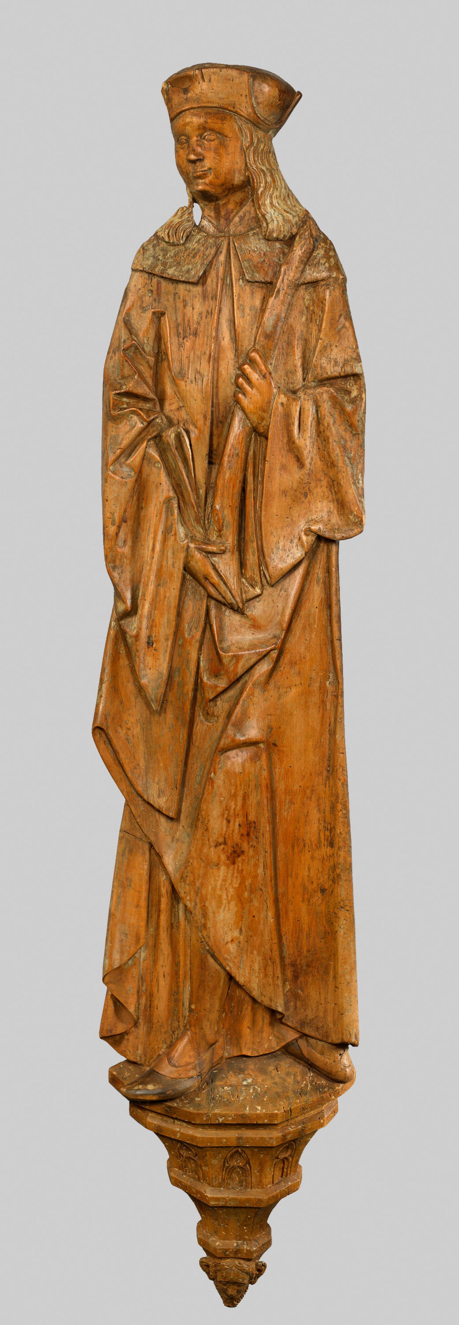 Lindenholz, geschnitzt, rücks. abgeflacht, Reste alter Fassung. Das Relief zeigt die stark gelängte Gestalt eines jungen Mannes mit einem Palmwedel als Attribut eines Märtyrers. Gewandet ist dieser in vornehm-herrschaftlicher Kleidung mit Schaube und Barett sowie modischen Schuhen. Sehr individuell gestaltet ist die polygonale Konsole, auf welcher der Heilige steht, die mit gotischem Maßwerk verziert ist und und in einen bärtigen Männerkopf mit Segelohren endet. Die lang gestreckten Proportionen und das Gewand mit seinen parallel laufenden Falten, die in Knautschzonen mit Faltdellen zusammengeführt werden, weisen auf den Einfluss Lederers hin. Im Landesmuseum Württemberg haben sich drei um 1520 in der Werkstatt Lederers entstandene Flachreliefs einer Hl. Barabara, einer Hl. Anna Selbdritt und einer Maria Salomae erhalten, die in ihrem Gewandfaltenstil vergleichbar sind. Aufgrund dieses Stilvergleichs und der wiedergegebenen Mode lässt sich das vorliegende Relief dem Umkreis Lederers zuweisen und um 1520 datieren. H. 134 cm.