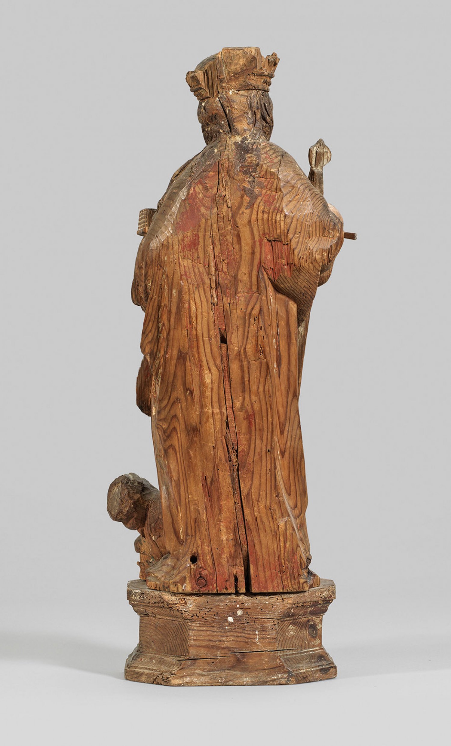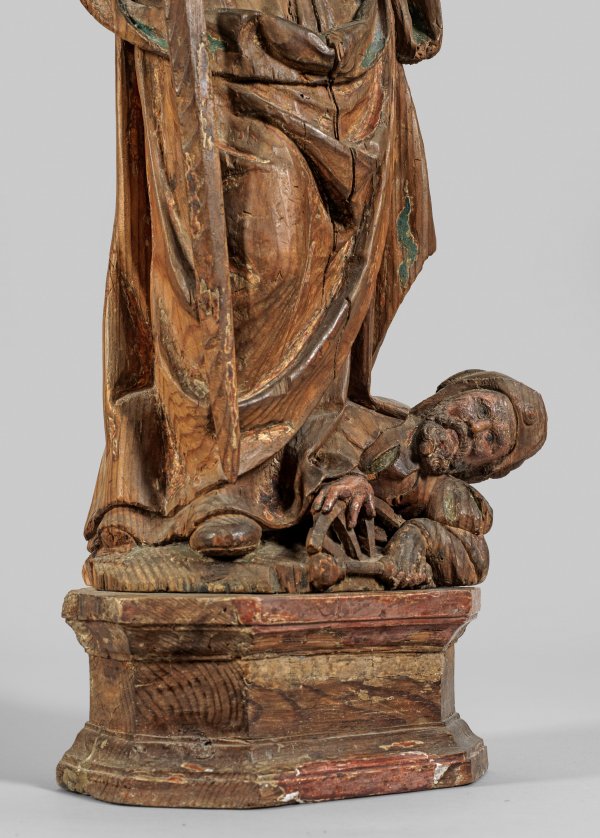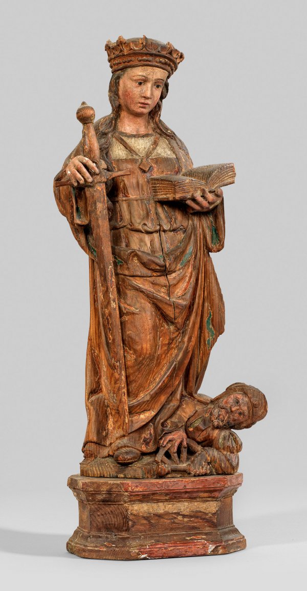 Zirbelholz, geschnitzt, rücks. abgeflacht, Reste alter Fassung. Die Skulptur stellt die Hl. Katharina in leichtem Kontrapost stehend als gekrönte, gebildete Königstochter mit langem, offenem Haar in einem bodenlangen Gewand und mit ihren charakteristischen Attributen der Märtyrerin dar. In ihrer linken Hand hält sie die aufgeschlagene Bibel mit der Lebens- und Leidensgeschichte Jesu; zu ihren Füßen erscheint die Halbfigur des Kaisers Maxentius mit einem Zepter als Herrscherinsignie und dem vom Blitz zerbrochenen Rad, mit dem sie ursprünglich gemartert werden sollte; in ihrer rechten Hand hält Katharina das Schwert, mit dem sie schließlich hingerichtet wurde. Während die Gesamtdarstellung dem tradierten Kanon folgt, folgt das Gewand der vornehmen Mode um 1520, was die Datierung erleichtert: Sie trägt ein unterhalb der Brust gegürtetes Kleid, das an der Taille reich gerafft ist und an der Schulter den Blick auf einen fein gefalteten Stoff freigibt. Sockel nicht zugehörig. H. 62 cm.