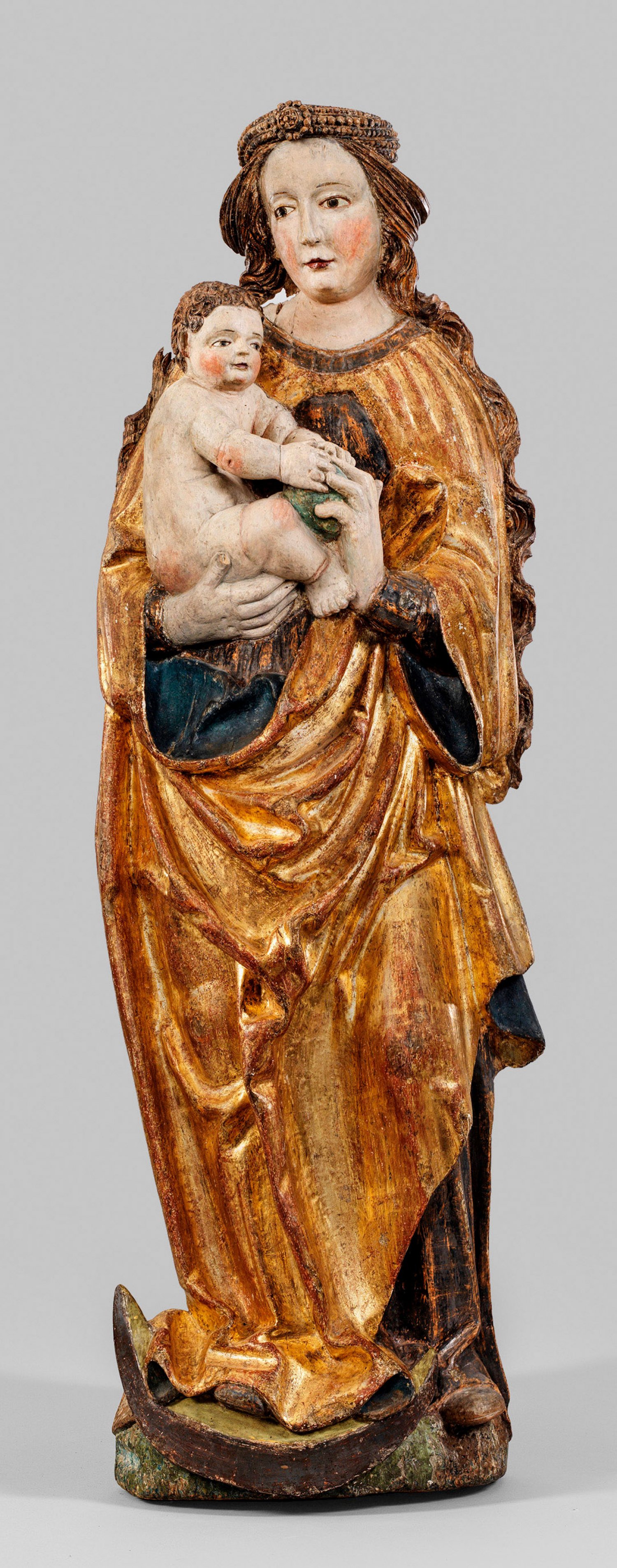 Lindenholz, geschnitzt, rücks. abgeflacht und ausgehöhlt, partiell alte bzw. originale Fassung und Vergoldung. Die reliefplastische Skulptur stellt Maria auf der Mondsichel im prononciertem Kontrapost stehend dar, die mit ihrer rechten Hand das sitzende, unbekleidete Christuskind hält. Gemeinsam umfassen beide die Weltkugel. Bekleidet ist Maria der Tradition folgend in einem bodenlangen, blau-goldenen Mantel; der Schnitt des gegürteten Kleides und die breiten, kuhmaulartigen Schuhe und der in sich gedrehte Perlenreif folgen allerdings der vornehmen Mode Anfang des 15, Jhs.; Die sich partiell rhythmisch wiederholenden, schüsselartig stauenden bzw. eckig umbrechenden Falten ihres Mantels lassen zusammen mit den modischen Details und der Behandlung der Gesichter und Hände ebenfalls auf eine Datierung um 1520 schließen. Die frontal dem Betrachter zugewandte, rückwärtig gehöhlte Skulptur dürfte ursprünglich entweder als zentrale Figur eines Marienaltars gedient haben oder vor einer Wand auf einer Konsole platziert worden sein. H. 111 cm.