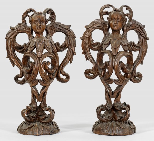 Gegenstücke. Lindenholz, durchbrochen geschnitzt und dunkelbraun gebeizt. Aus Akanthusranken gebildete, gehöhlte Figuren mit Engels- bzw. Puttiköpfen. H. 37,5 cm-39 cm.