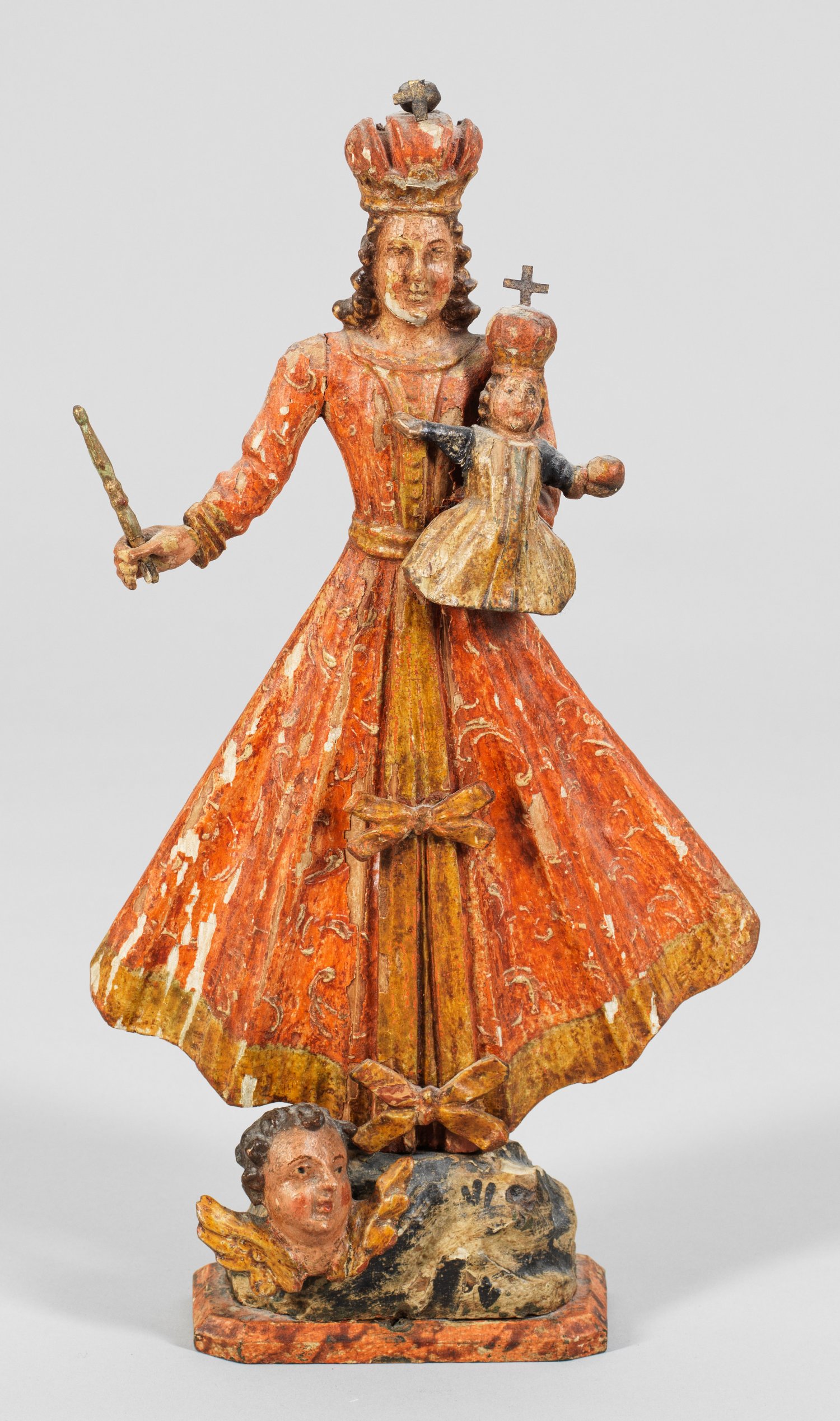 Holzscheitelmadonna Holz, geschnitzt und polychrom gefasst. Auf einem Felssockel mit einem Engelskopf stehende Maria in schleifenverziertem Rokoko-Kleid, in der rechten Hand ein Zepter haltend, mit dem linken Arm das Kind, beide mit großen Kronen. Nach dem Vorbild der Madonna im Kloster Svatá Hora (Heiliger Berg) in Pribram gestaltetes Gnadenbild der Volkskunst. H. 38 cm.