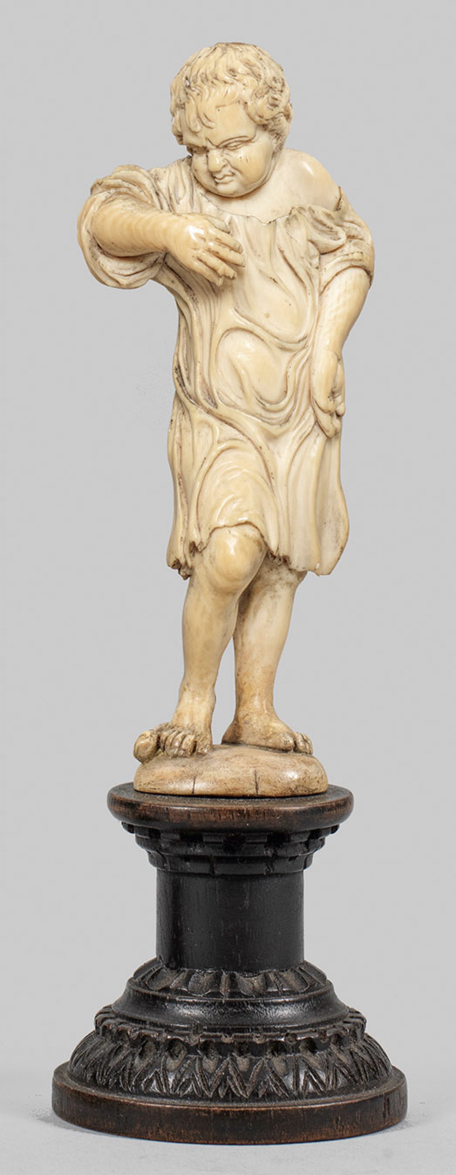 Elfenbein vollplastisch geschnitzt. Ebonisierter Holzsockel. Auf einer kleinen ovalen Plinthe stehender Knabe mit gegürtetem, knielangem Gewand, der seine Nase rümpft. Im Detail sehr fein ausgeführte Statuette mit subtiler, ausdrucksvoller Figurencharakterisierung. Ornamental geschnitzter Sockel. Figuren-H. 12 cm. Ges.-H. 17,3 cm.
