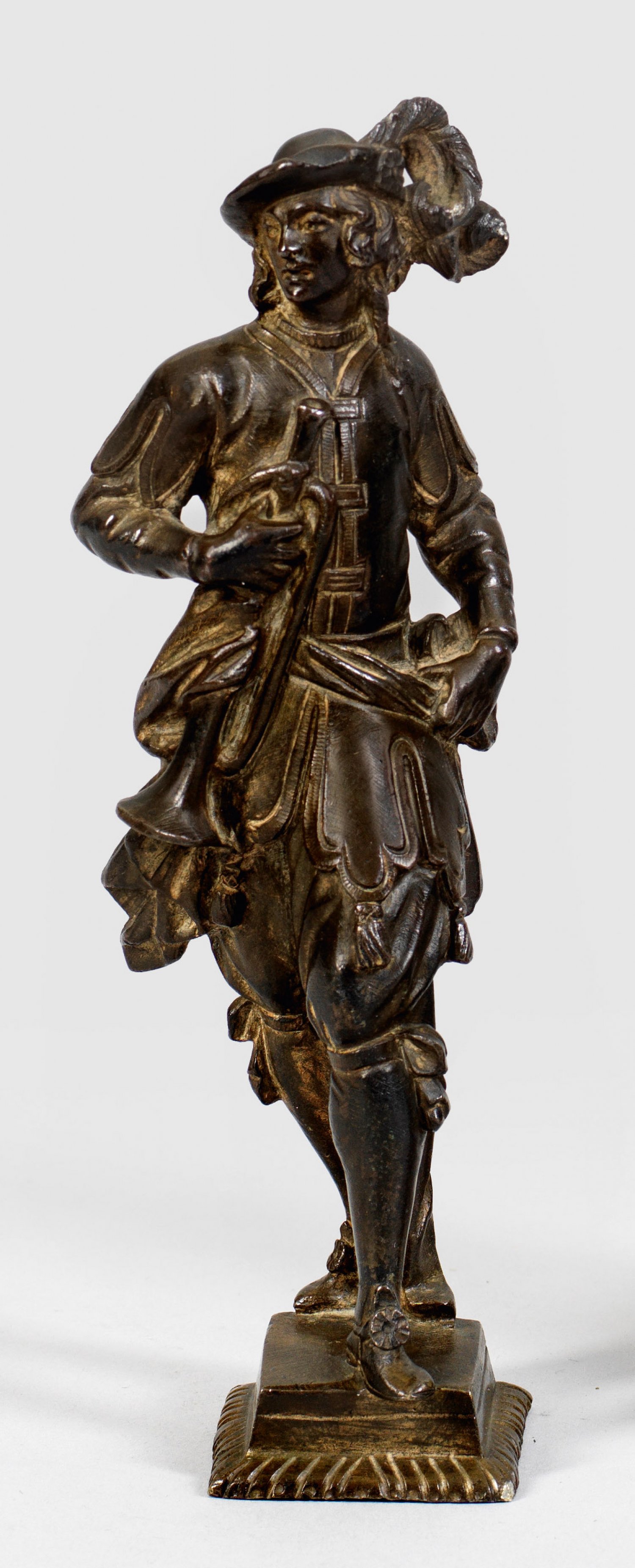 Bronze, dunkelbraun patiniert. Auf einer kleinen, quadratischen Plinthe meisterhaft modellierte, vollplastische Darstellung eines schreitenden, höfischen Musikers, gekleidet in der galanten Mode der Watteauzeit mit Kniebundhose, Schnallenschuhen, Federhut, langer Weste mit Quasten und um die Hüfte geschlungener Schärpe. H. 15,5 cm.
