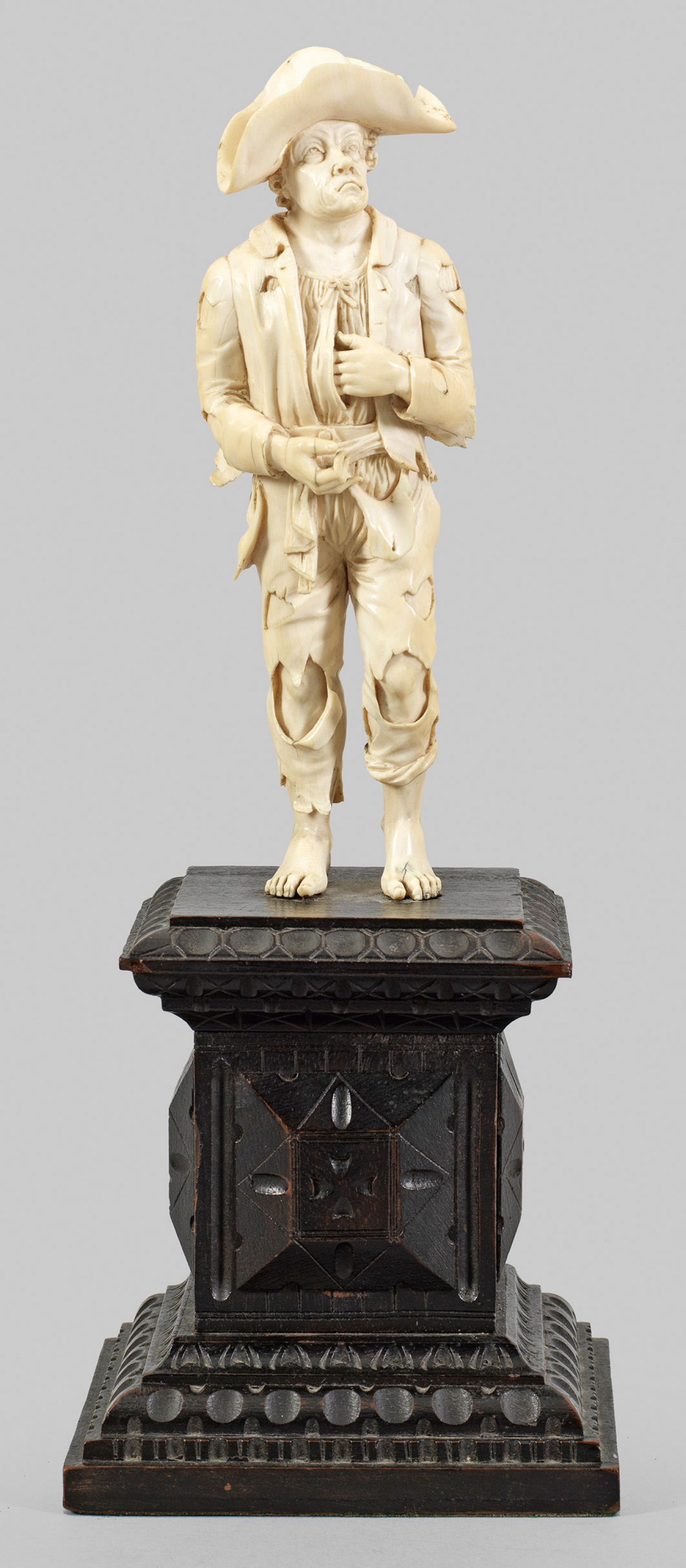 Elfenbein, vollplastisch geschnitzt. Ebonisierter Holzsockel, möglicherweise später. Im Detail sehr fein ausgeführte, ausdrucksvoll charakterisierte Figur eines Bettlers in zerlumpter, zerissener Kleidung und mit breitkrempigem Hut, der seine linke Hand in sein Hemd steckt. Stil und Motiv der Figur lassen auf eine Dresdener Arbeit aus dem Umkreis Krügers schließen, der ab 1711 für die Kunstkammer August des Starken und für Zar Peter den Großen tätig war und 1733 zum Hofschnitzer in Dresden ernannt wurde. Im Grünen Gewölbe befinden sich eine Reihe von Elfenbeinfiguren Krügers, darunter vier vergleichbare Bettler aus dem Besitz der Gräfin Königsmarck. Neben Werken Krügers selbst, lässt sich die Statuette mit einer Gruppe von Figuren aus der Hand Carl August Lückes (um 1710 Dresden - 1779 Danzig) vergleichen, der Hofbildhauer am Schweriner Herzogshof war, welche sich im Staatl. Museum Schwerin aus altem Herzogsbesitz erhalten haben. Figuren-H. 18 cm; Ges.-H. 30,5 cm.