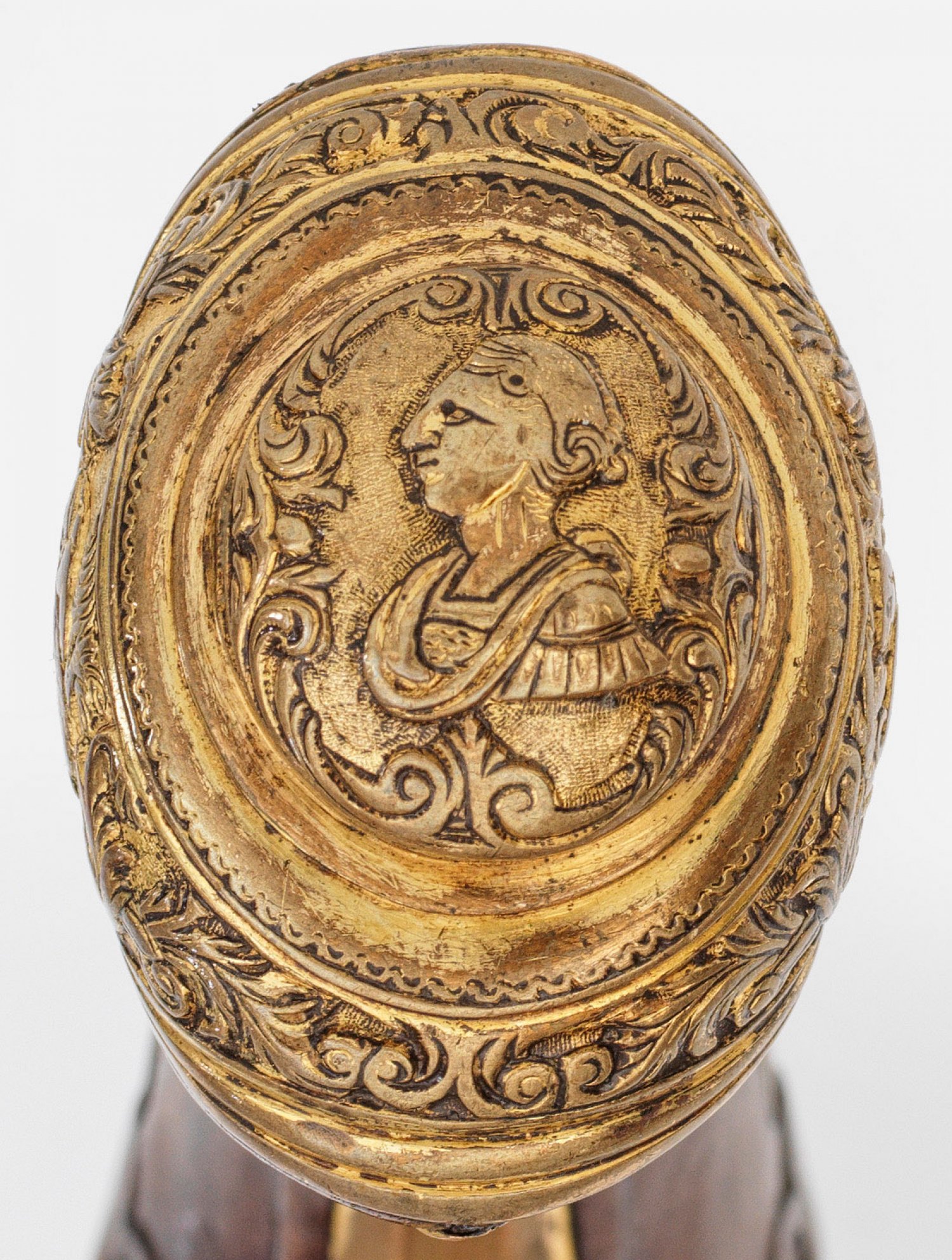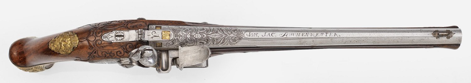 Nussbaumvollschäftung mit fein geschnitzten Rocaillen. Runder Eisenlauf mit Klappkimme sowie gravierter Signatur "Joh. Jac. Kuchenreuter". Hornnase. Am Laufansatz zwei goldgefütterte Marken mit Monogramm "IIK" sowie Reitermarke. Über Kammer nummeriert "1". Steinschloss aus Eisen. Auf Schlossplatte Darstellung einer Frau mit Hund sowie Hirsch und Hirschkuh. Profilierte, dekorierte Gegenplatte und Garnitur aus feuervergoldetem Messing mit weiteren Darstellungen von Hirschen und Hunden. Daumenplakette in Kartuschenform mit liegender Hirschkuh. Knauf mit Profil einer Frau in römischem Gewand. Hölzerner Ladestock mit Horndopper. Länge 45 cm.