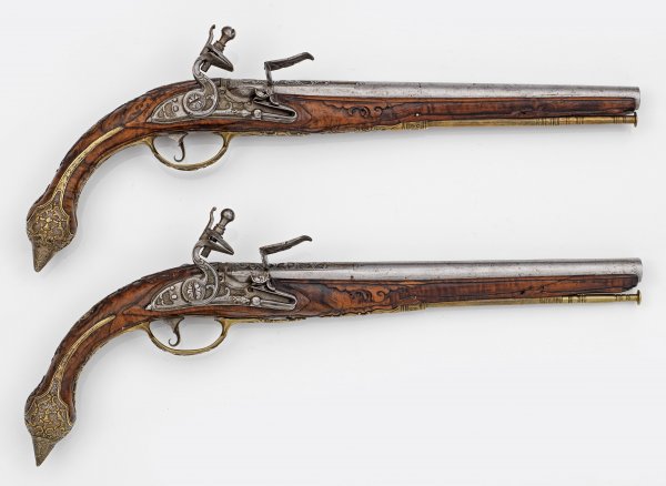 Paar Steinschloss-Pistolen Hergestellt für den osmanischen Markt. Nussbaumvollschäftung ornamentiert geschnitzt. Runder Eisenlauf. Oberhalb der Kammer mit reich verziertem Rocailledekor und kleiner Reserve mit bekrönter Fleur-de-Lis. Eisernes Steinschloss mit geschnittenen Ornamenten verziert, am unteren Rand sign. T.C. BA (?). Gegenplatte, kartuschenförmige Daumenplakette und Garnitur aus reliefiertem Messing mit Silber hinterlegt. Schlanker Kolben. Reliefplastisch gearbeitete, runde, zum Abschluss hin spitz zulaufende Kolbenkappe. Messing-Ladestock. Teilw. besch.; L. 39 cm.