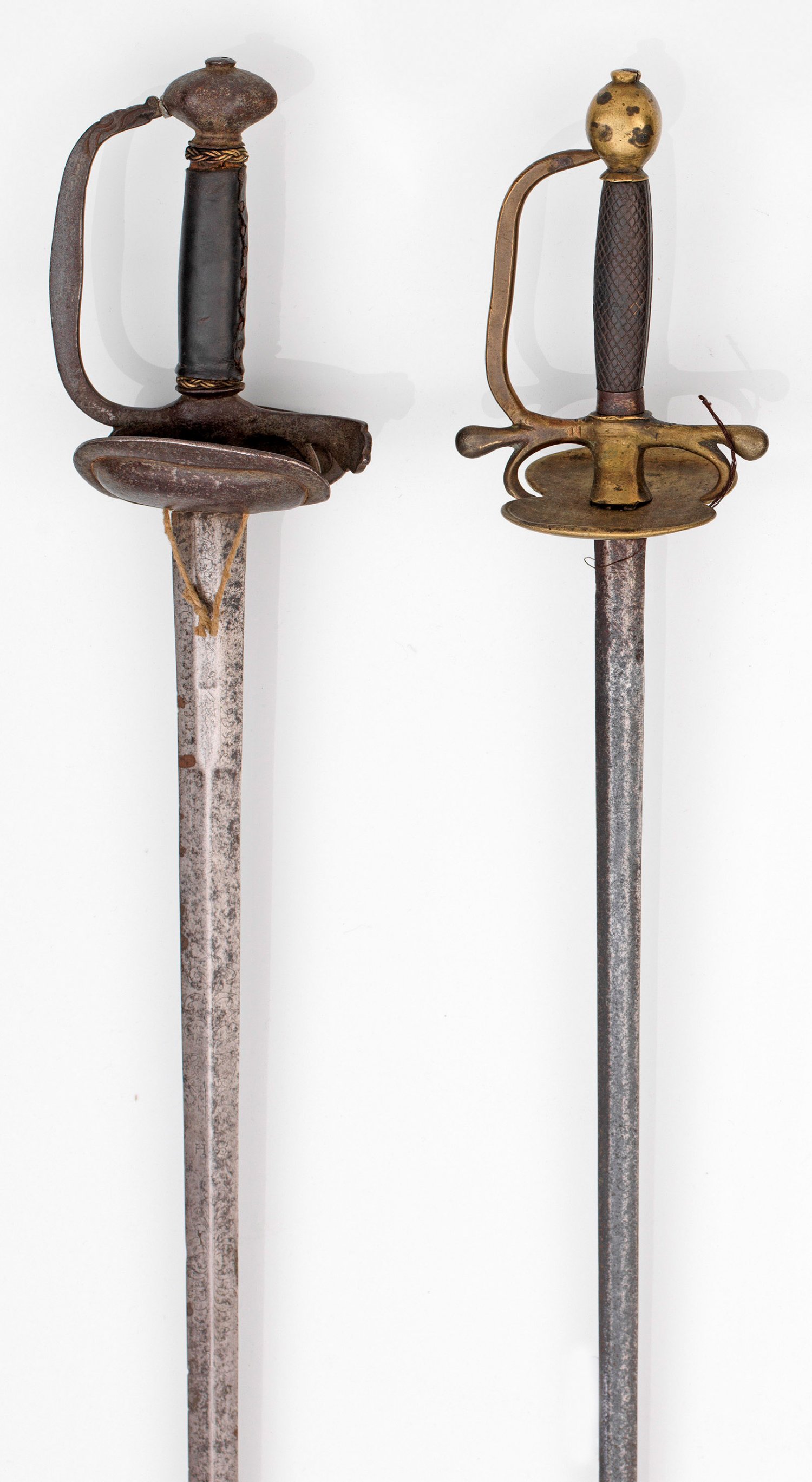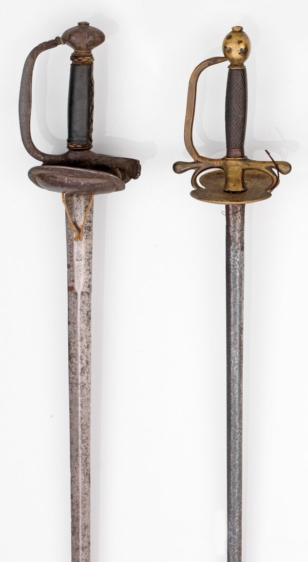 Paar Degen Messing, Holz und Eisen. U. a. mit Inschrift, graviertem Herrenbildnis, Initialien S H und Türkenbunde in Messing. Teilw. besch. bzw. rep.; L. 89 cm - 104 cm.