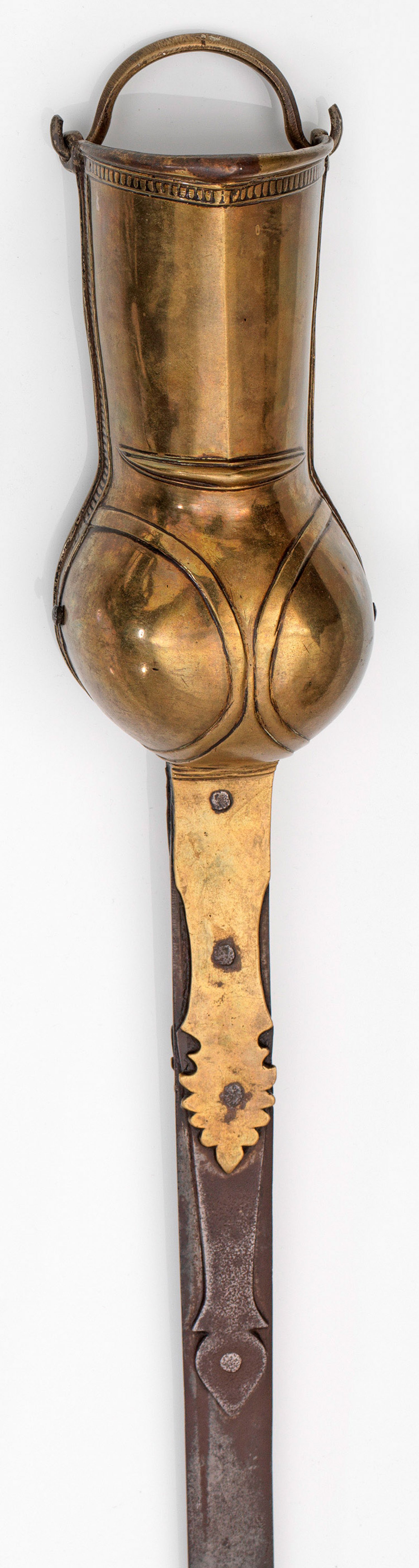 Indische Pata Zweischneidige, flexible und vernietete Eisenklinge. Getriebener Hand- und Unterarmschutz aus Messing in Form einer abgerundeten, geballten Faust. Die Ränder mit schlichtem Stabfries verziert. Innenseitig Griff und Gegenbügel für Halt am Unterarm. Das Pata wurde als Hiebwaffe oder Lanze von der Kavallerie gegen die gegnerische Infanterie eingesetzt. Altersbedingte Gebrauchsspuren. L. 120 cm.