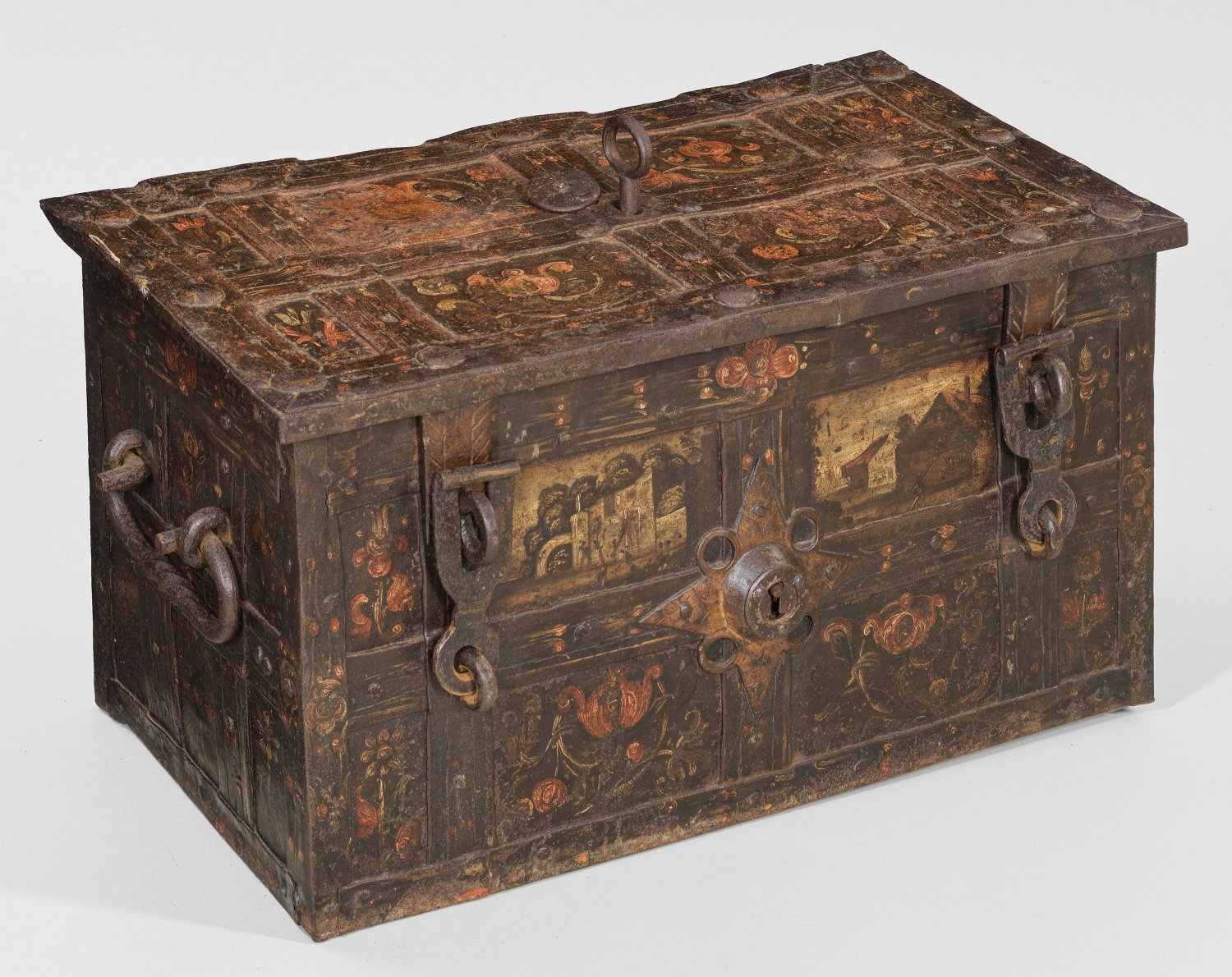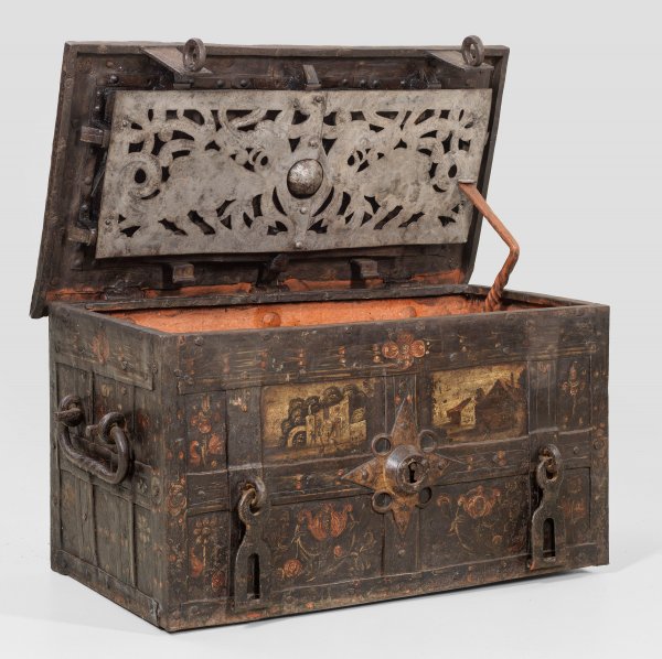 Barocke Kriegskasse Eisen, geschmiedet und polychrom bemalt. Innen rot lackiert. Rechteckiger Korpus mit Scharnierdeckel und seitlichen Tragegriffen sowie über Kreuz vernieteten Bandbeschlägen. Frontseitig zwei Überfallriegel für Vorhängeschlösser und ein Scheinschloss. Auf dem Deckel zentrales Schloss. Schauseiten mit Blüten und Ansichten von Häusern bzw. einem herrschaftlichen Gebäude verziert. Innen durchbrochen gearbeitete, gravierte Schlossabdeckung mit zwei Drachen, die runde Kapelle flankierend. Acht Zuhaltungen. H. 42 cm. 79 cm x 42 cm.
