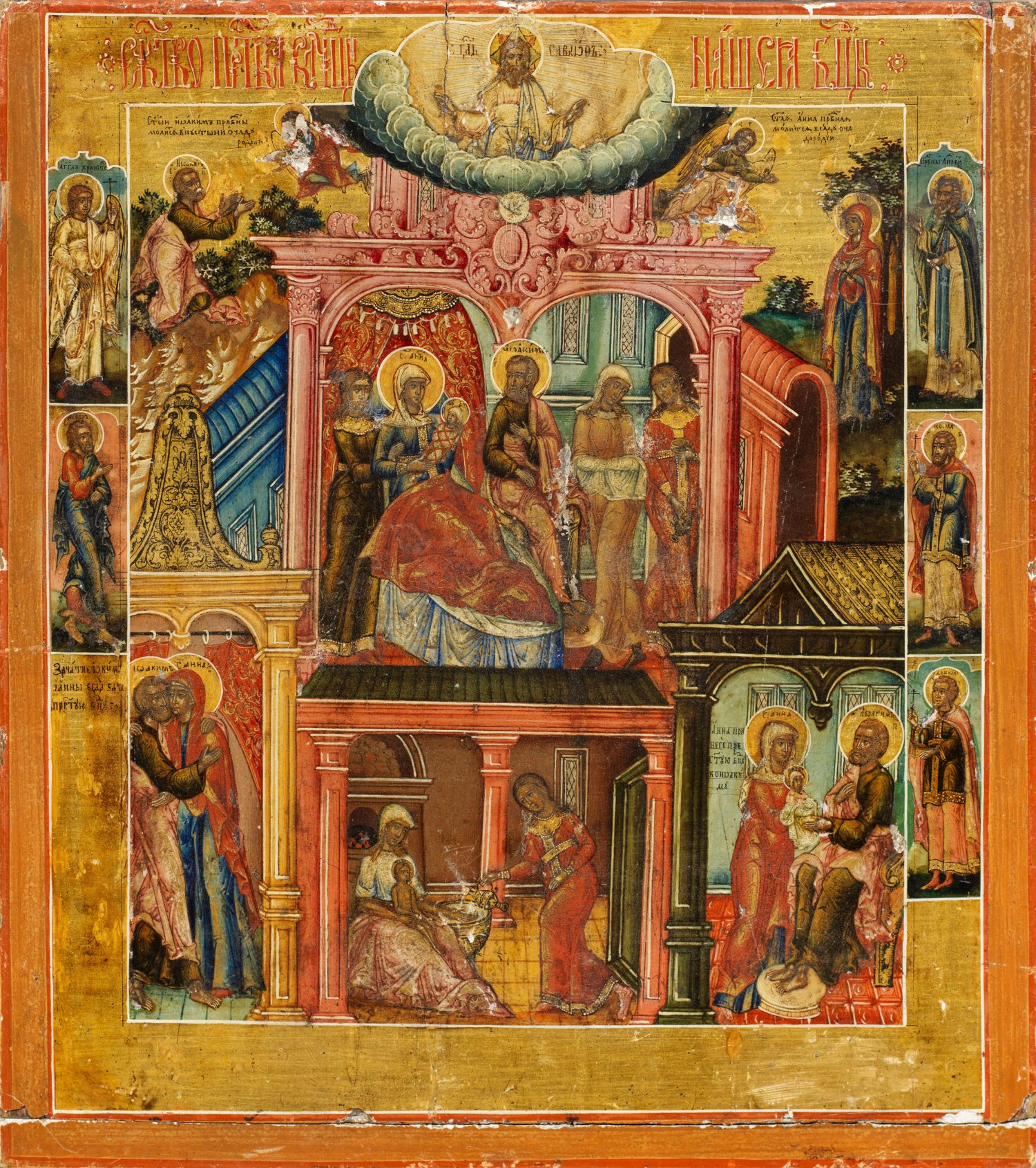 Ikone "Mariae Geburt" Äußerst feine, polychrome Temperamalerei mit Gold auf Holztafel. Zentrale Darstellung der Anna auf dem Geburtslager, flankierend die Eltern Joachim und Anna. Unterhalb Waschung des Kindes. Links unten die Vermählung vor der Heiligen Pforte, rechts unten szenische Darstellung Joachims und Annas mit auf dem Schoß sitzendem Kind. Oberer Abschluss mit Gottvater auf der Wolkenbank. Verschiedene Randheilige. Kirchenslawisch bez.; Rest.; Teilw. besch.; 33 cm x 29 cm.