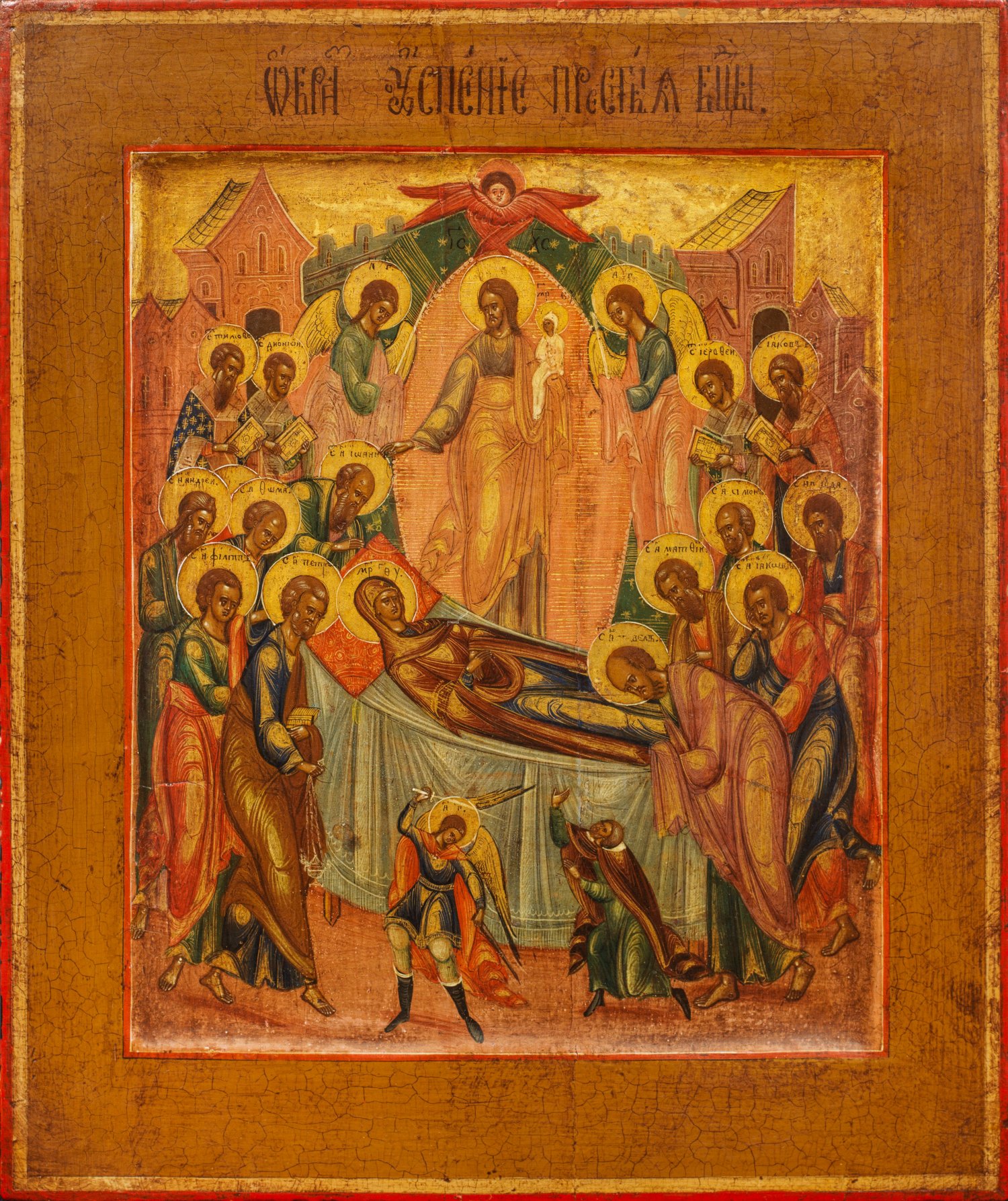 Ikone "Entschlafen der Gottesmutter" sog. Koimesis. Tempera mit Gold auf Holz. Vor architektonischer Kulisse auf dem Totenbett liegende Gottesmutter, umgeben von den Heiligen Aposteln sowie weiteren Heiligen. Zu ihrer Seite Christus in der Mandorla mit der Seele der Gottesmutter.