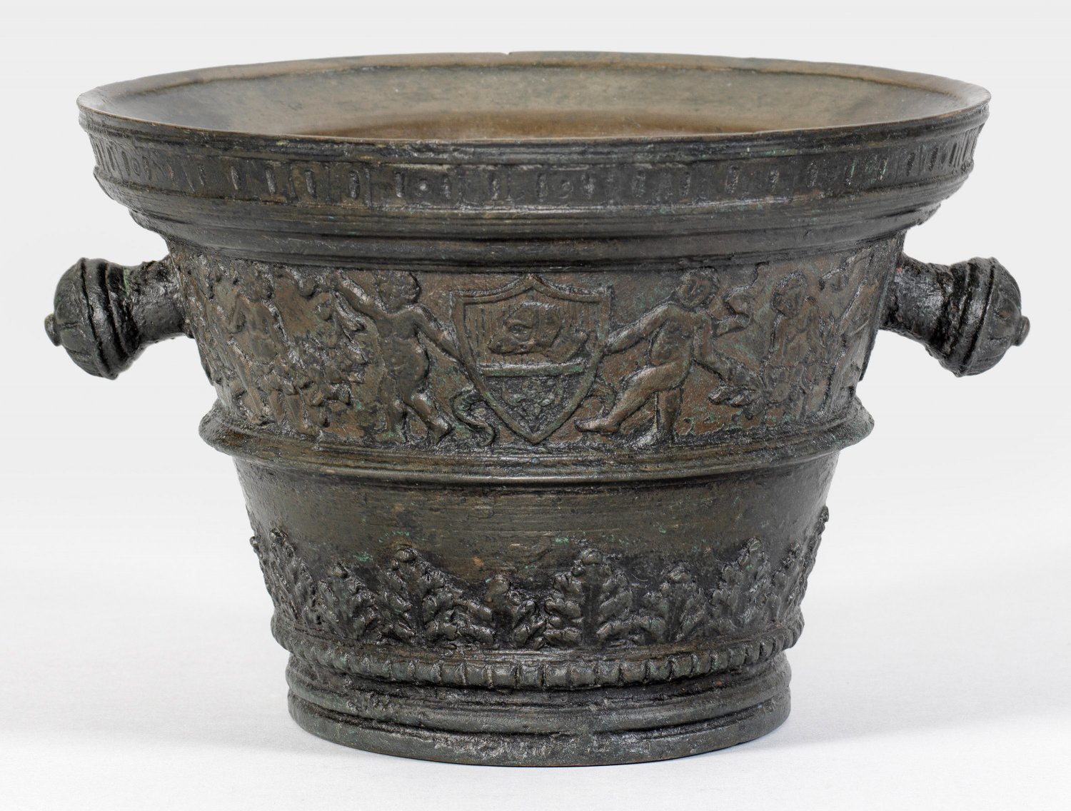 Barock-Mörser Bronzeguss mit schwarzer Patina. Dickwandige Glockenform, nach oben in breites, mit Stab- und Punktedekor verziertes Lippenprofil ausschwingend. Konisch auf gestuftem, flachem Stand. Zwei Knaufgriffe mit Rosetten verziert. Gefäßwandung durch Profilwulst gegliedert. Oben umlaufender Fries mit mehreren Putten, Blumengirlanden und zwei Wappen haltend. Auf den Wappen u. a. ein Hundekopf im Profil bzw. ein Ritterhelm und ein Stern. Unten umlaufendes Akanthusband mit profiliertem, plastisch gearbeitetem Stabfries. Minim. Gebrauchsspuren. H. 14,5 cm. D. 21,5 cm.
