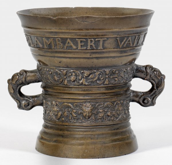 Niederländischer Bronzemörser Bronzeguss mit goldbrauner Patina. Glockenform auf leicht profiliertem, flachem Stand. Zwei Henkel in Form von stilisierten Delfinen. Durch mehrfache Profilwülste gegliederte Wandung. Umlaufend zwei Arabeskenbänder mit kleinen Tierdarstellungen sowie mit Maskaronköpfen, u. a. von Engeln verziert. Auf dem Lippenrand Schriftband mit Namen des Auftraggebers und Datum "Lambert van Saelenghe anno 1656". Mit Pistill. Altersbedingte Gebrauchsspuren. H. 15,5 cm. D. 15,5 cm.
