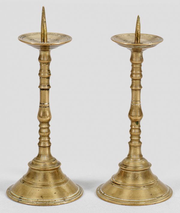 Paar Renaissance-Miniaturleuchter Messing. Über glockenförmig hochgezogenem Stand mehrfach gegliederter Balusterschaft, in runder Traufschale mit Dorn übergehend. Wandung unterteilt von feinen Profillinien. H. 10,5 cm (mit Dorn).