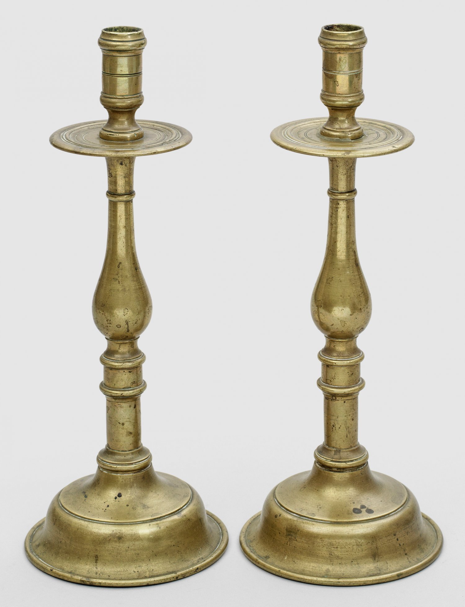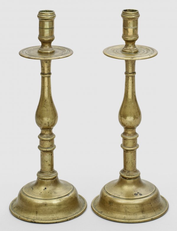Zwei Kragenleuchter 1-flg.; Auf gewölbten Sockeln schlanke Balusterschäfte mit Nodi und breiten, profilierten Tropfschalen. Dazu ein Windlicht und ein Historismus-Leuchter, besch.; H. 36 cm - 36,5 cm.