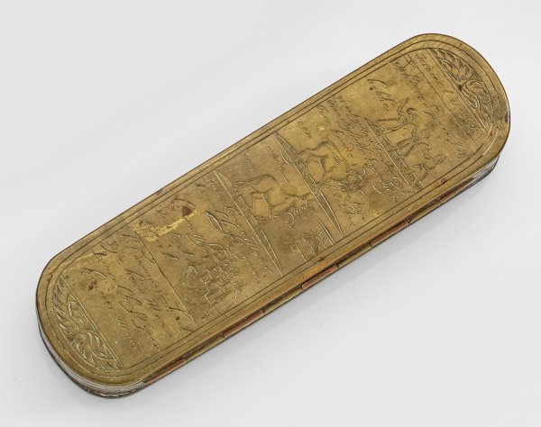 Tabakdose Messing und Kupfer, graviert. Oblonge Form. Deckel und Bodenunterseite unterteilt in Felder mit Sinnsprüchen, Mensch- und Tierdarstellungen. Auf der Wandung stilisierte Ranken. H. 3 cm. 16,2 cm x 4,8 cm.